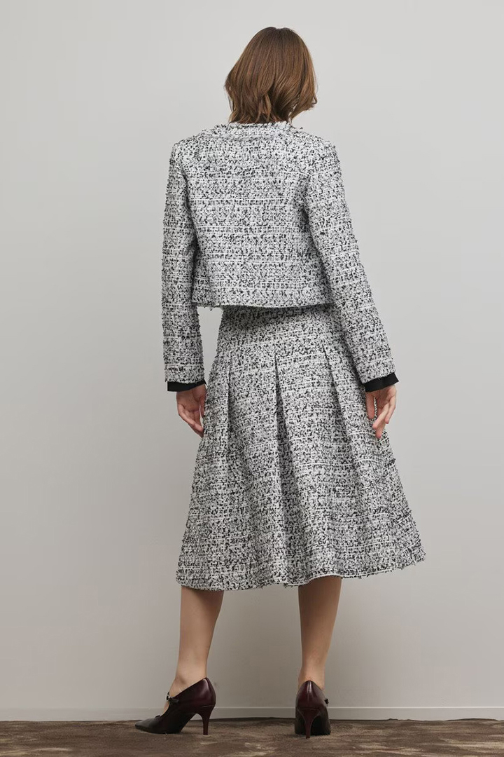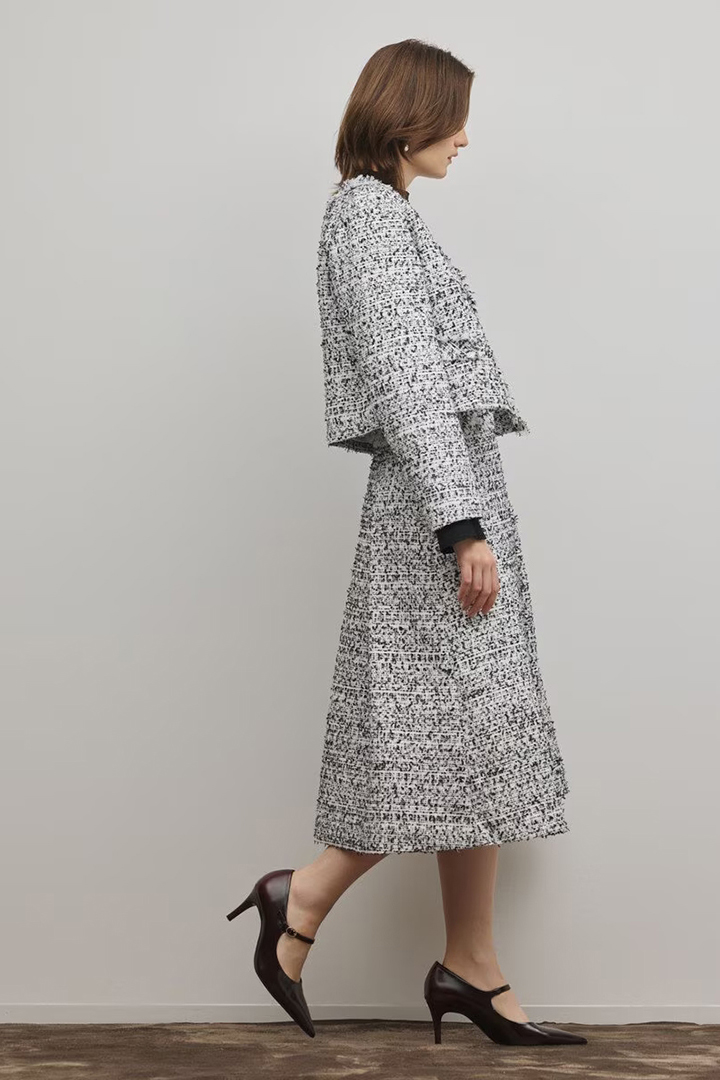 お揃いのスカートを合わせることで、手軽にワンランク上のセットアップスタイルをお楽しみいただけます。