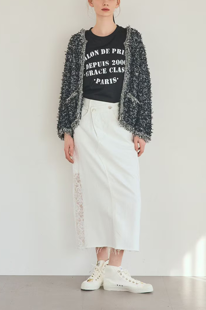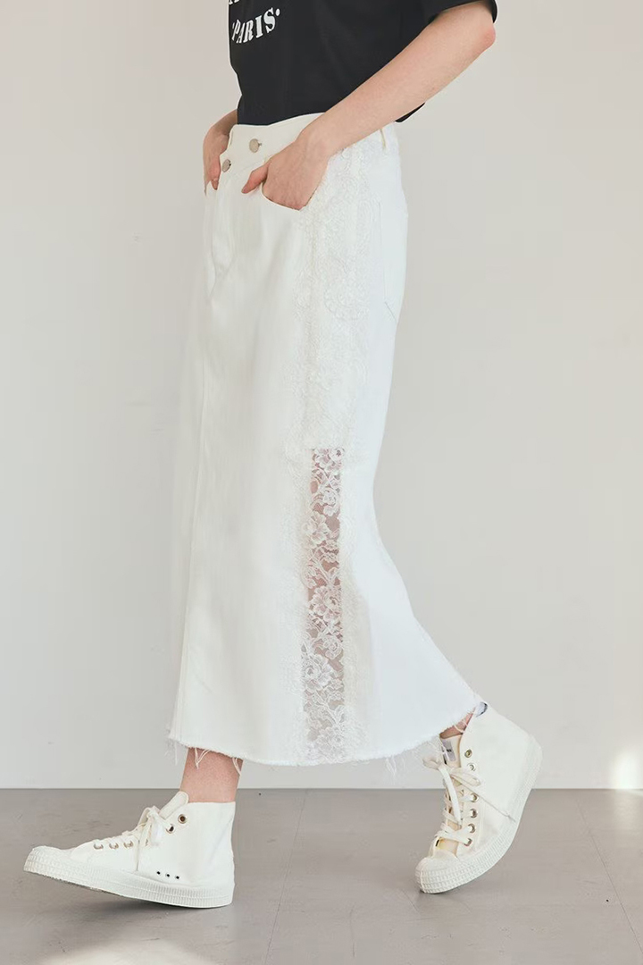 定番のデニムスカートにレースを組み合わせ、新鮮な表情に仕上げた一着。