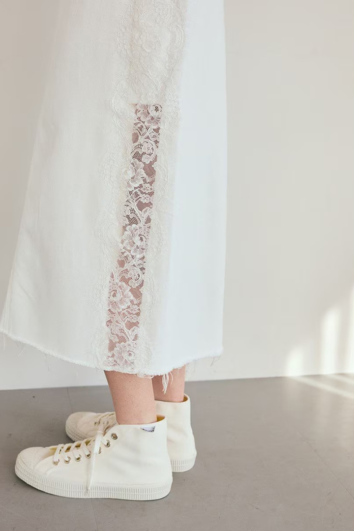 落ち感のあるしなやかなデニムに、シアー感が綺麗で高級感溢れるコードレースをサイドにつけて、シーズンらしい軽やかなデザインにお作りしました。
