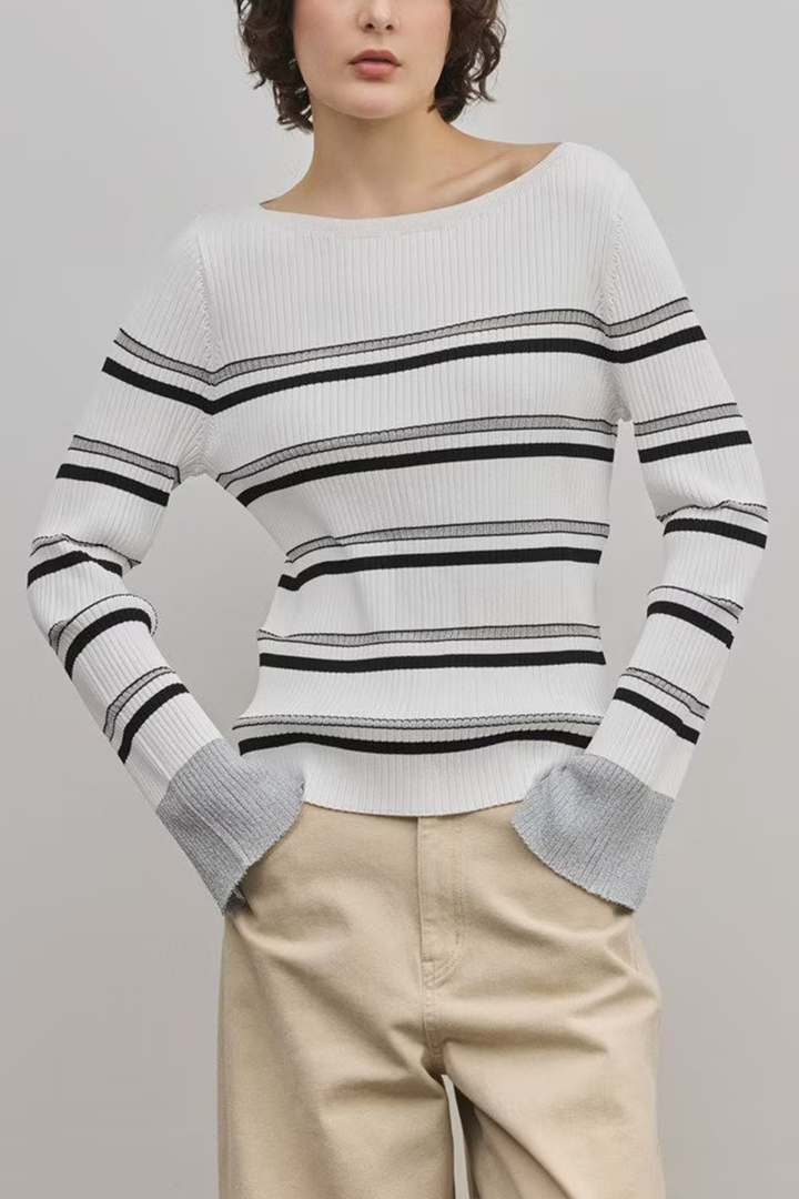 レーヨンブレンドの糸で編み立てた大人な印象のリブニットトップス。