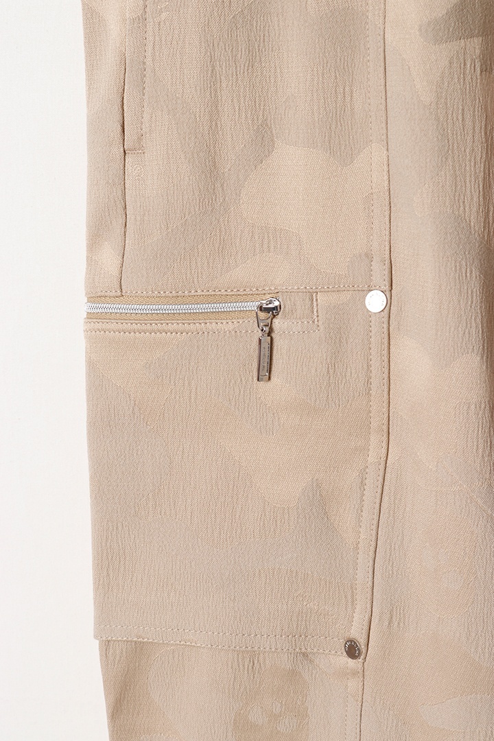 カモフラージュパターンのストレッチジャカード素材を使用したロングパンツ。上品な光沢感と適度なストレッチ性を兼ね備えた季節を問わず活躍する万能アイテム。