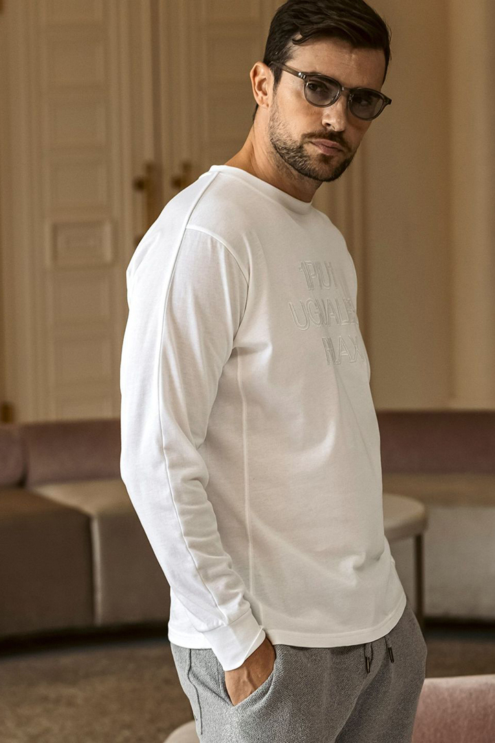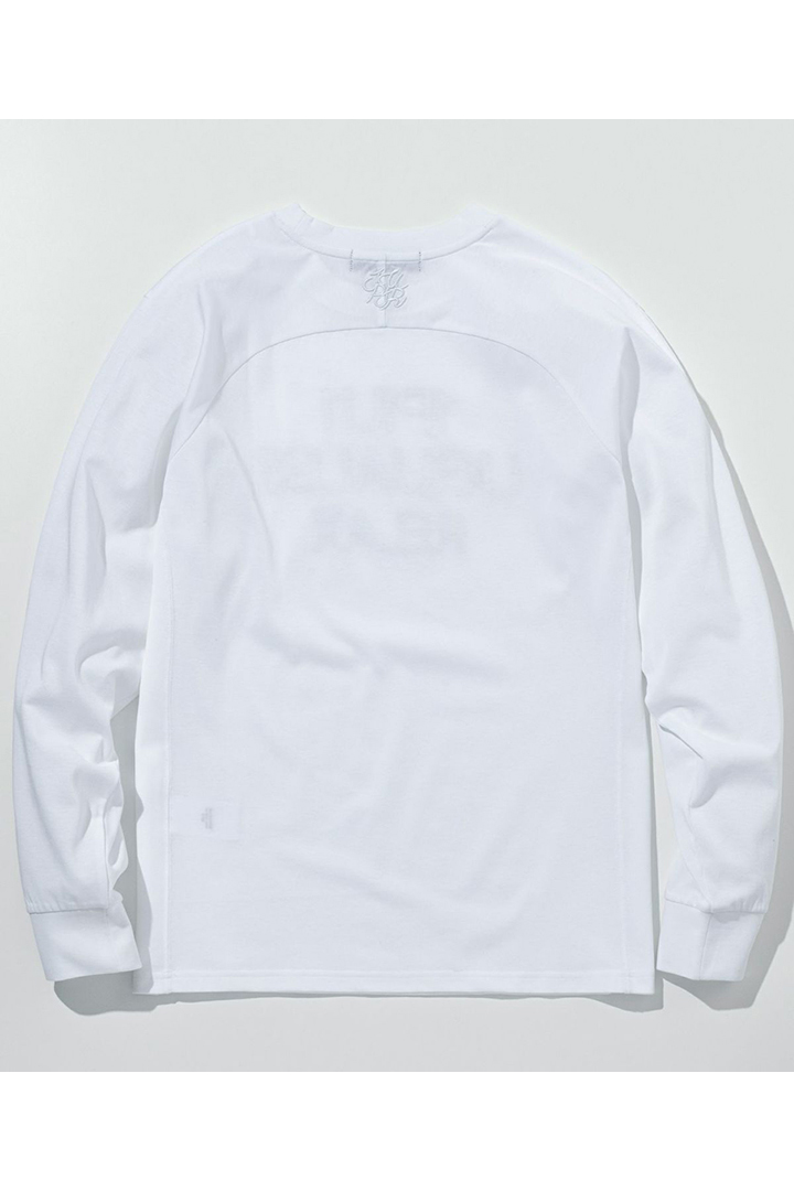 フロントにブランドロゴを3段に配置した長袖カットソー。