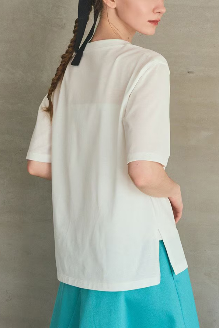 上からアウターを羽織った際のバランスにもこだわり、春から真夏までロングシーズンご活躍いただける一枚に仕上げました。