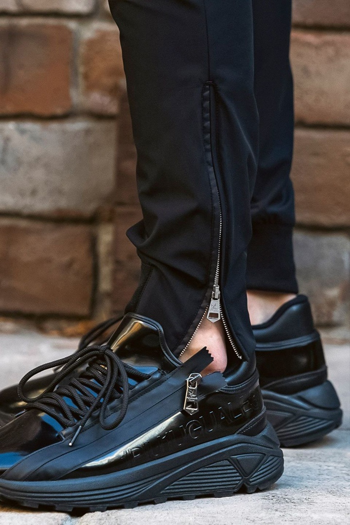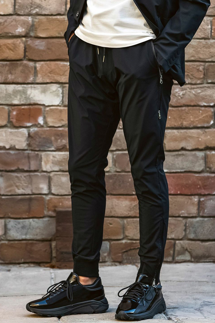 左右に走るアシンメトリーなファスナーポケットがモードなアクセントをプラス。