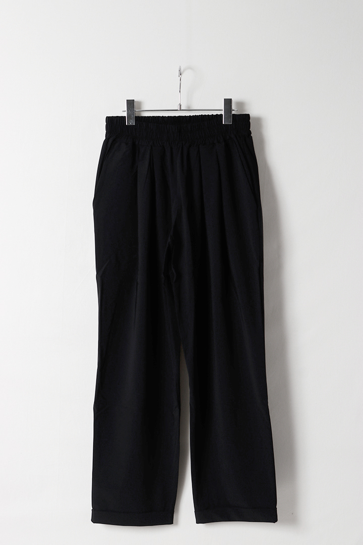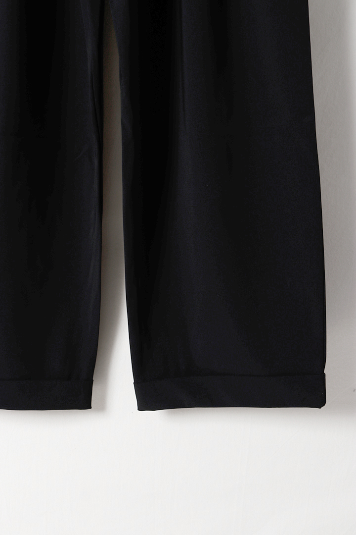 一見カジュアルなデザインながら、深めのツータックが生み出す美しいドレープと、ダブル仕立ての裾によって、さりげない上品さを演出します。