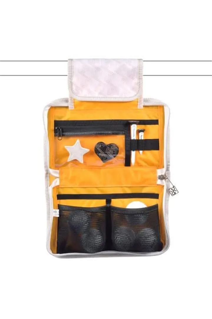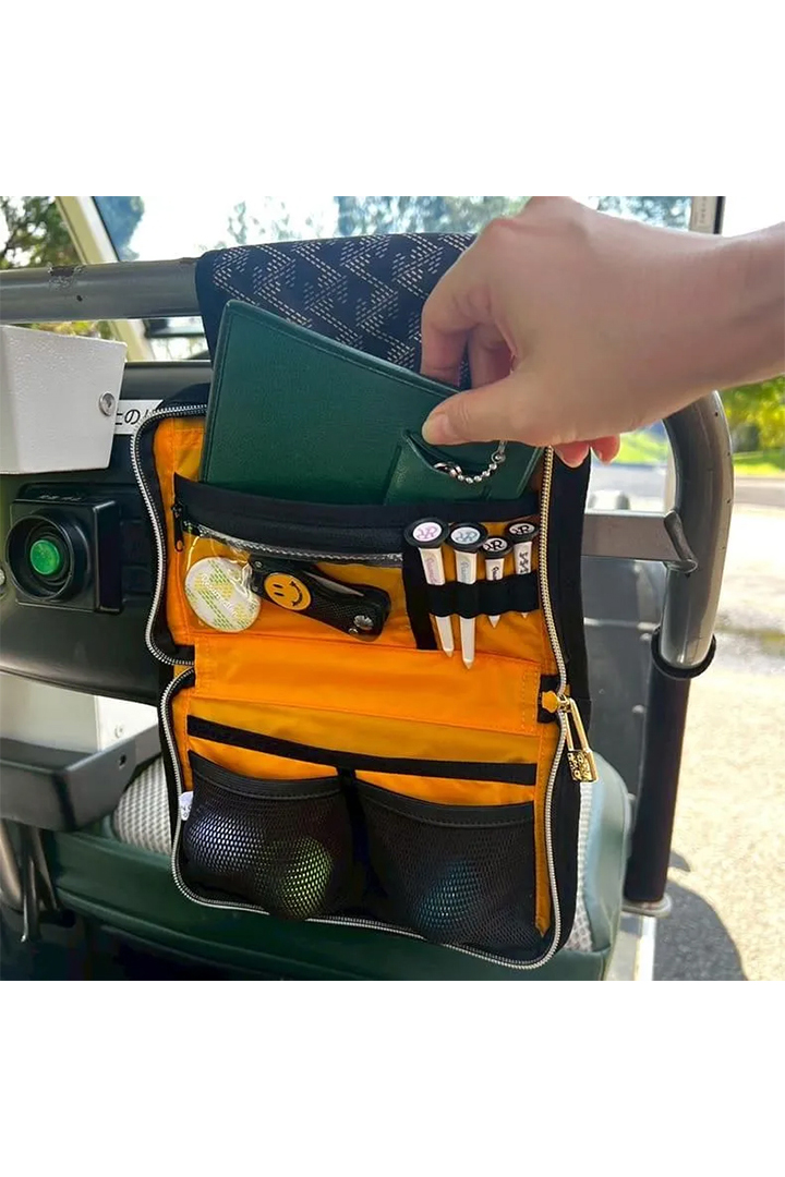 ゴルフ前日に、必要なモノをポーチに準備して当日はゴルフカートの後部座席前のバーに吊るしてご使用いただけます。