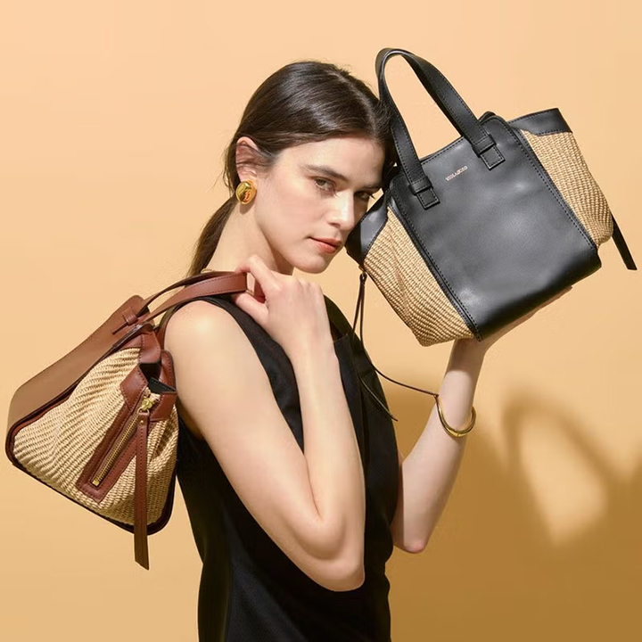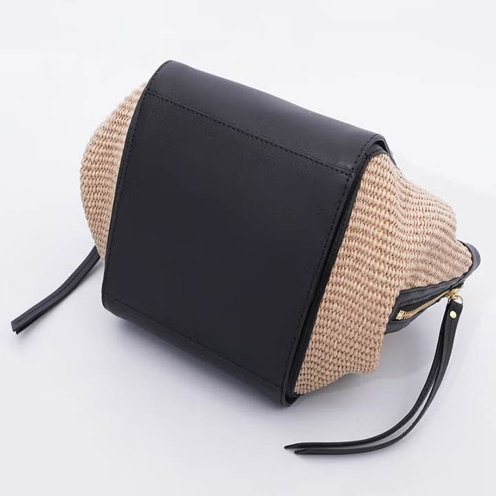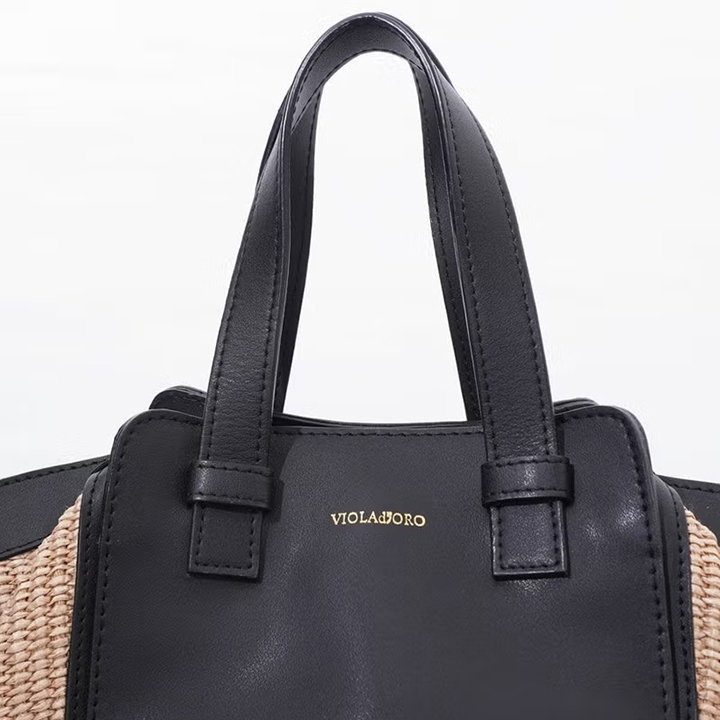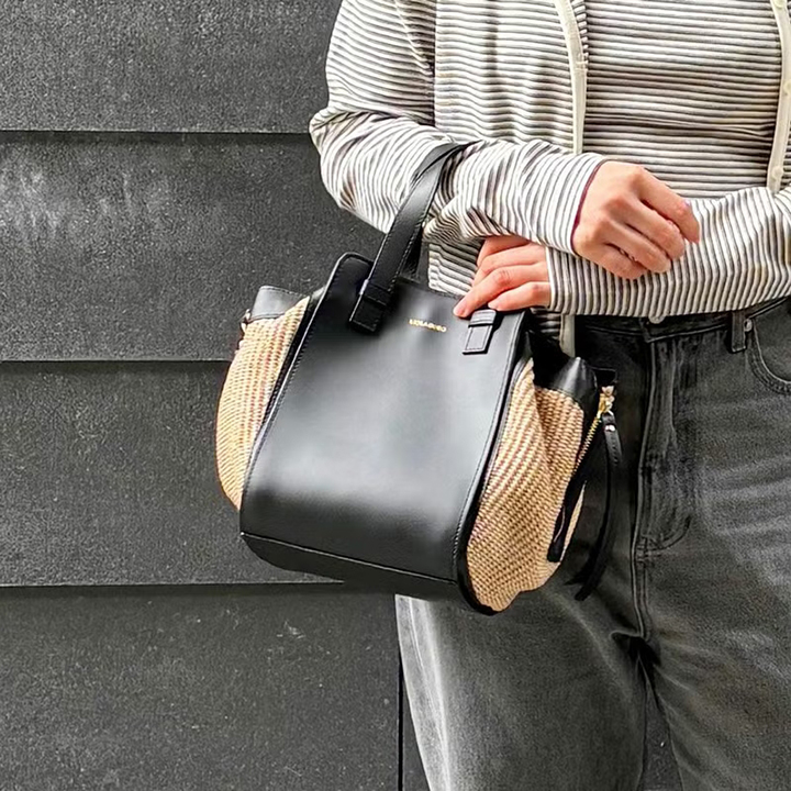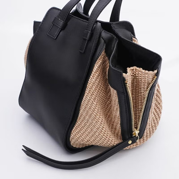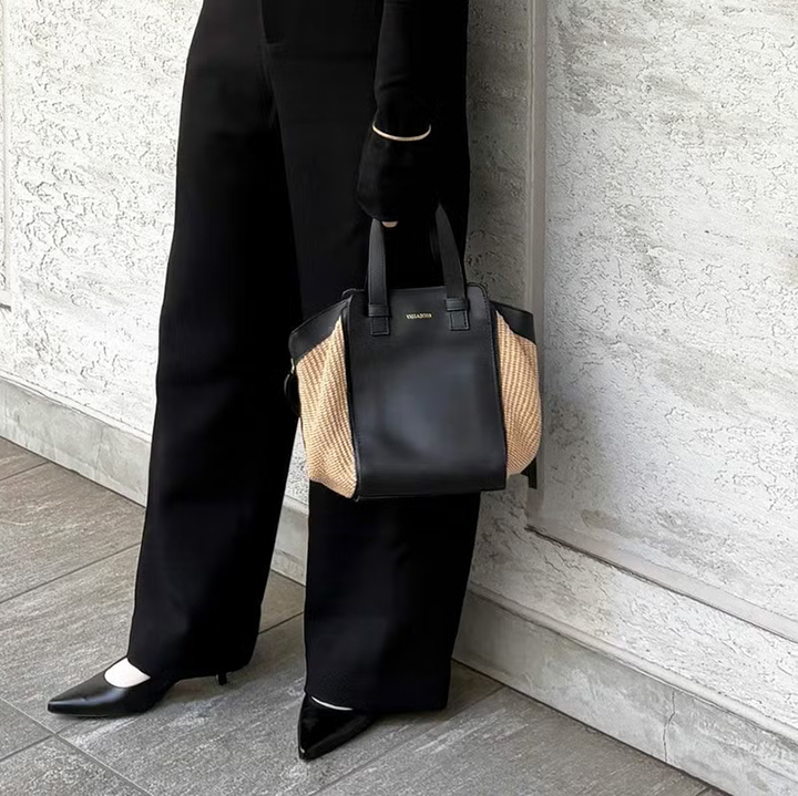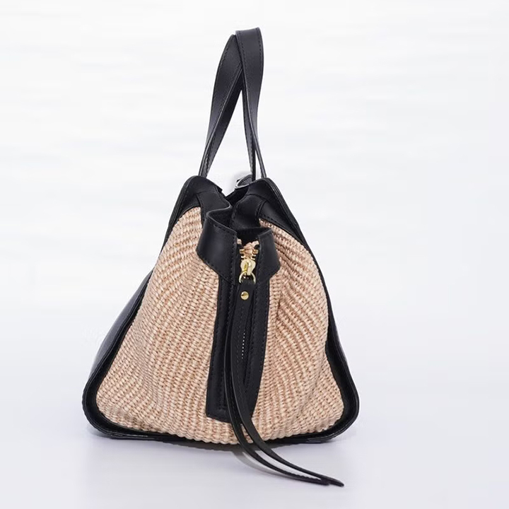 上品な風合いが魅力のラフィア調シートとレザーのコンビがアクセントになったハンドバッグ。