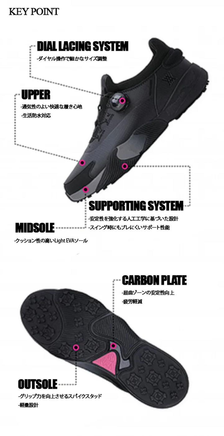 アウトソールにはグリップ力を高めたスパイクパターンを採用しました。 機能性とモダンなデザインを融合させた、ANEWのパフォーマンスラインを象徴する一足です。