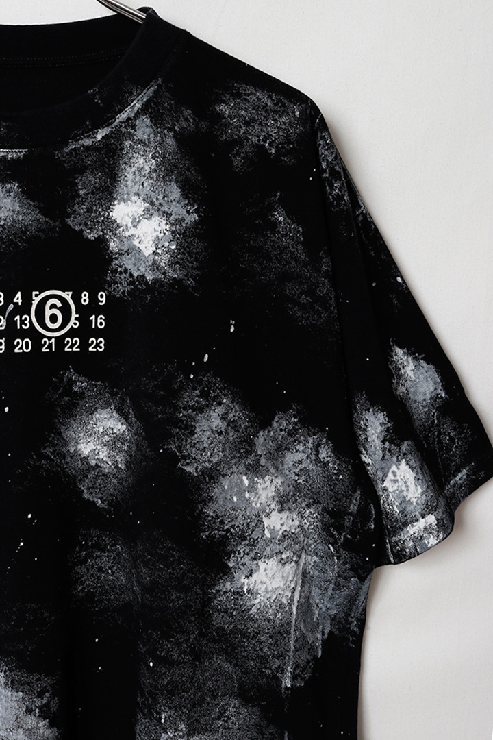 不規則なペイントの跡がTシャツのクリーンな輪郭を打ち破り、使い込まれたような独特の質感を与えています。