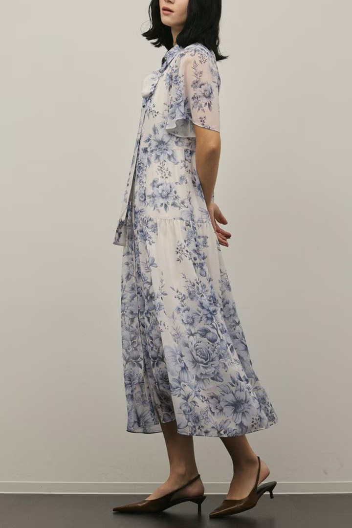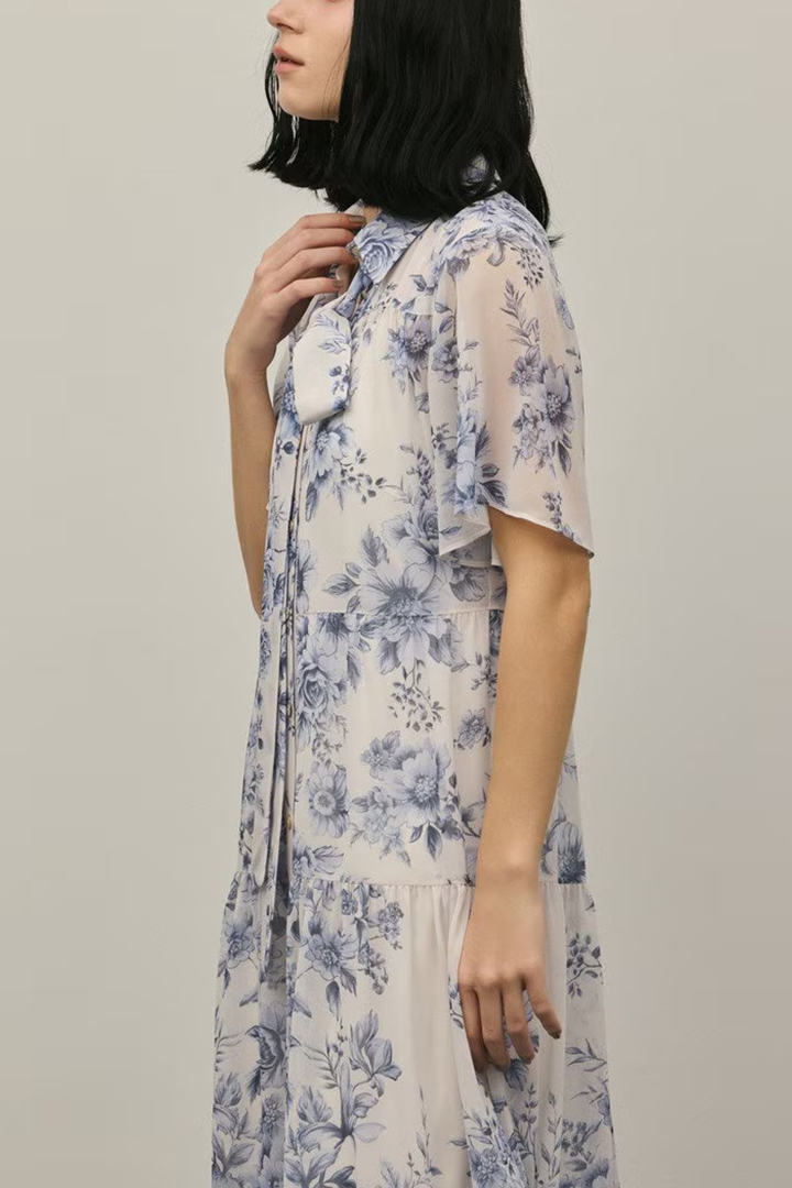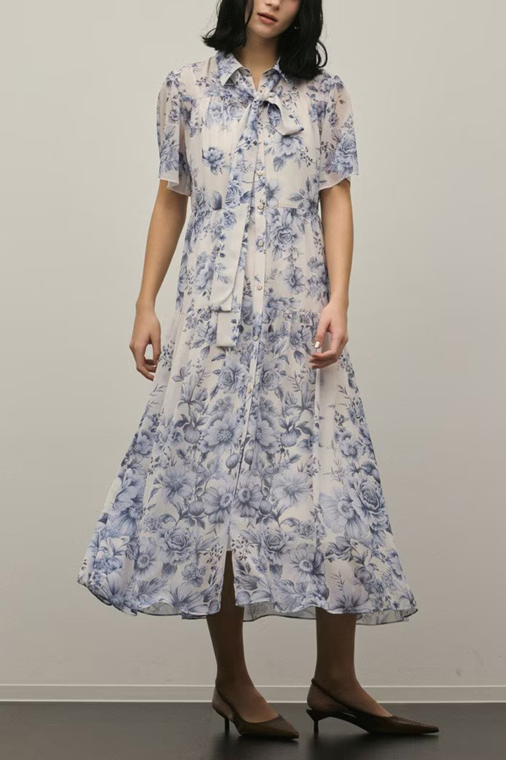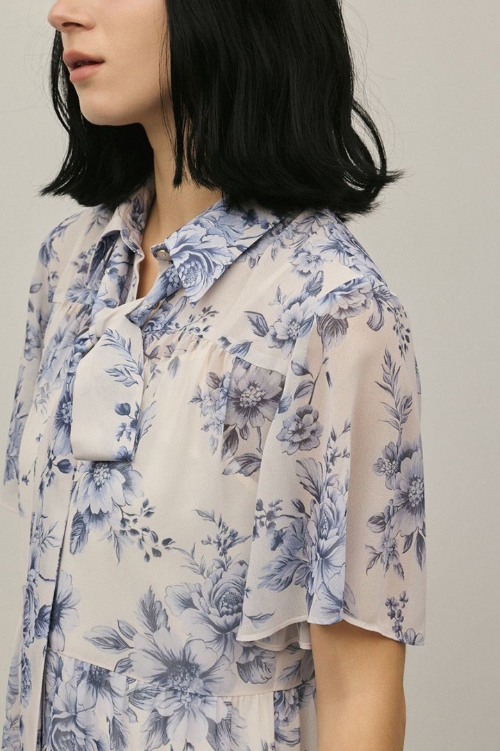 そこに繊細なタッチで描かれた春らしいフラワー柄をのせて、品のあるワンピースに仕上げました。
