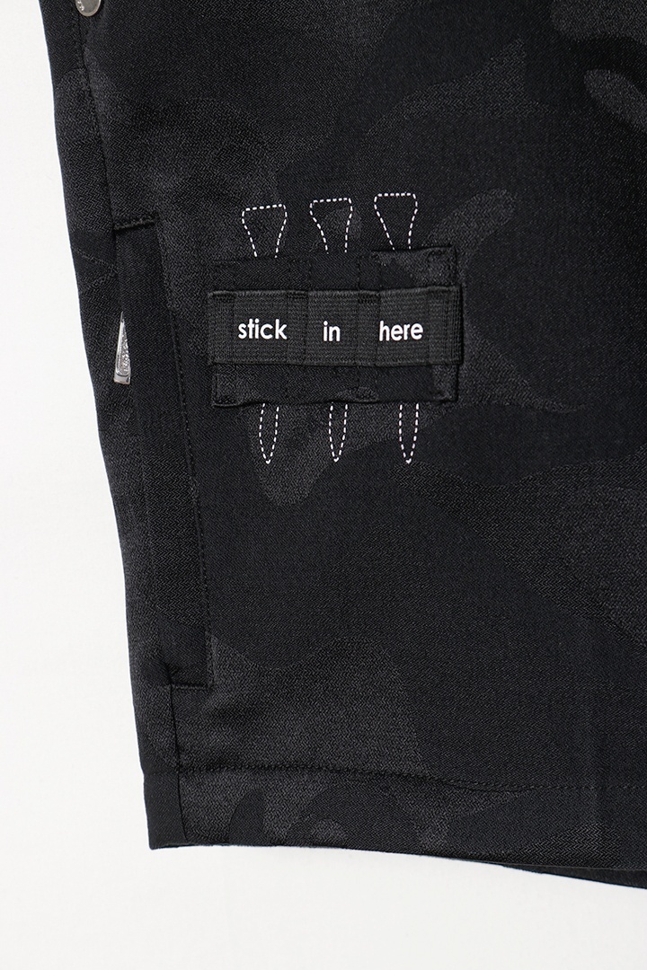 カモフラージュパターンのストレッチジャカード素材を使用したショートパンツ。上品な光沢感と適度なストレッチ性を兼ね備えた季節を問わず活躍する万能アイテム。