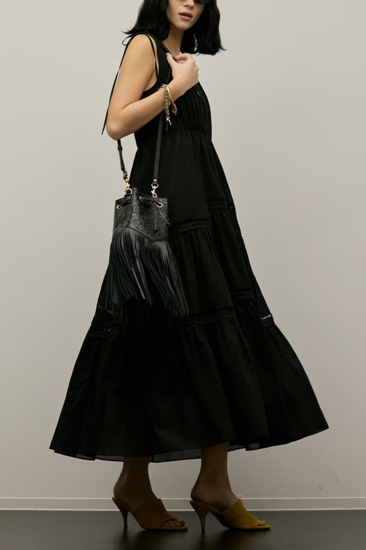 用尺をたっぷりとった贅沢な蹴回しや分量感、そして可憐なティアードラインが歩いた時に優美に揺れ動き、装いを華やかに印象付けます。