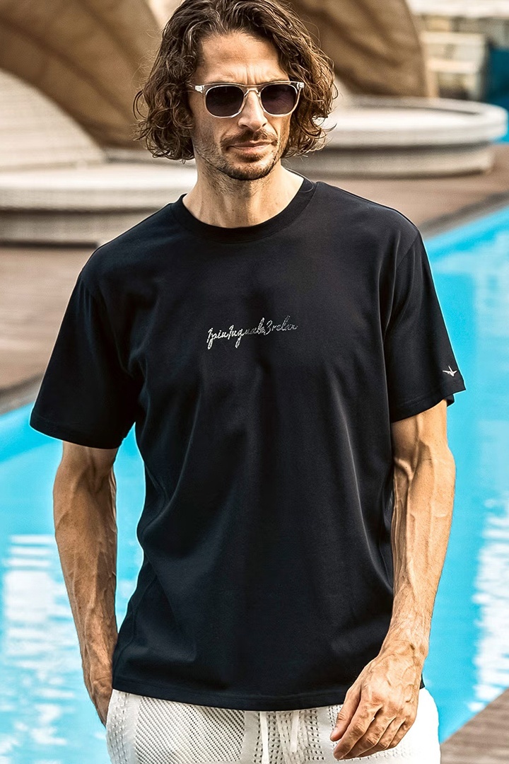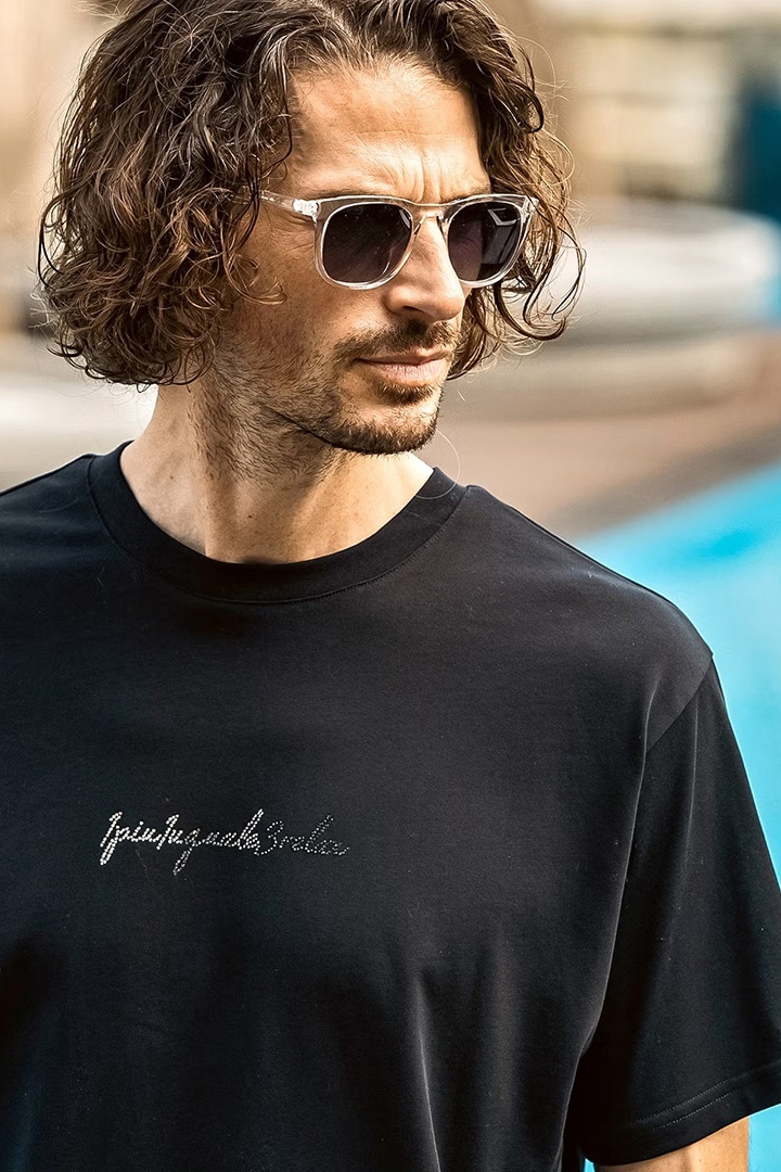 1piu1uguale3 RELAX ウノピゥウノウグァーレトレ リラックス グラデーションラインストーン半袖ロゴTシャツ{-BFS} [UST-26065-BLK]