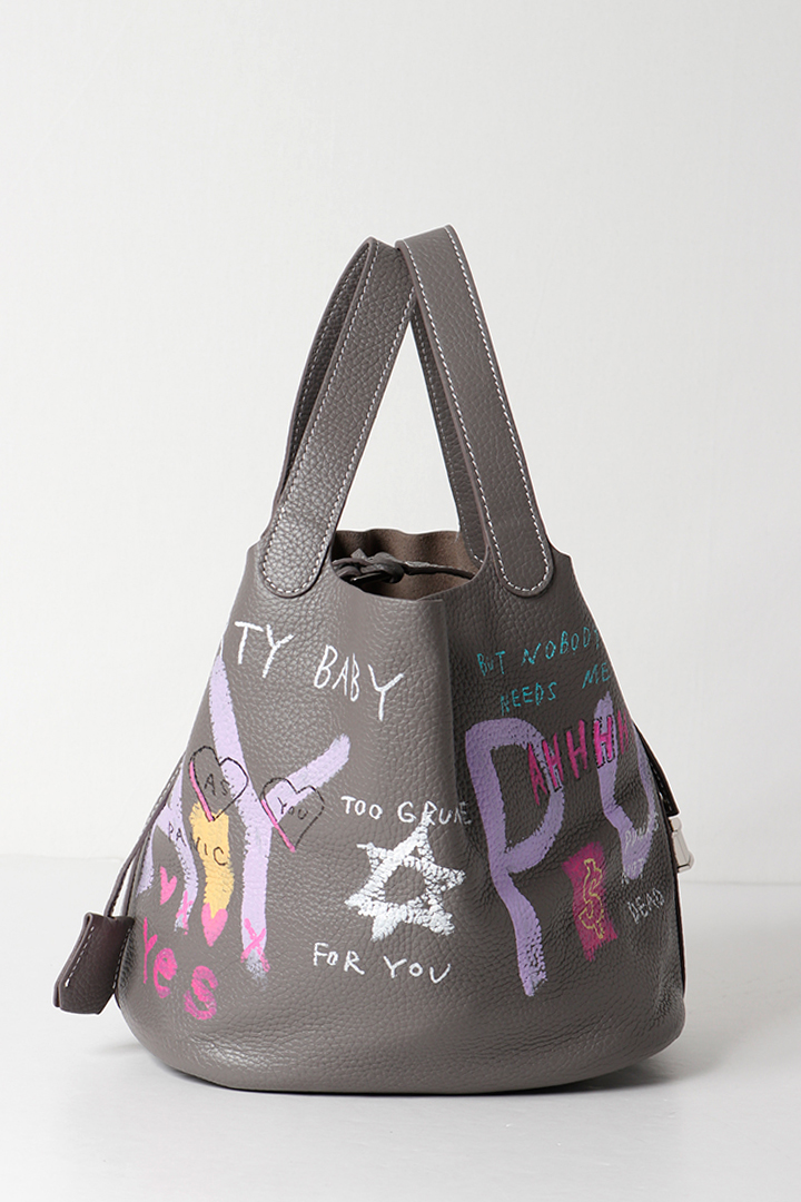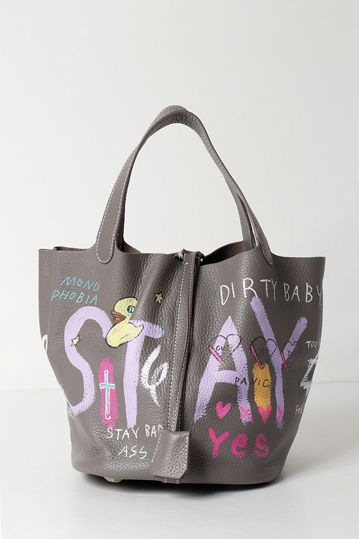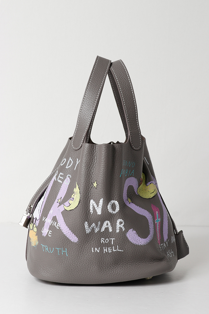 アーティスト、乾シンイチロウ(Shinichiro Inui)によりハンドペイントが施されたレザーバッグ。