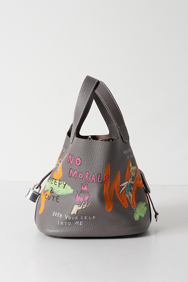 アーティスト、乾シンイチロウ(Shinichiro Inui)によりハンドペイントが施されたレザーバッグ。