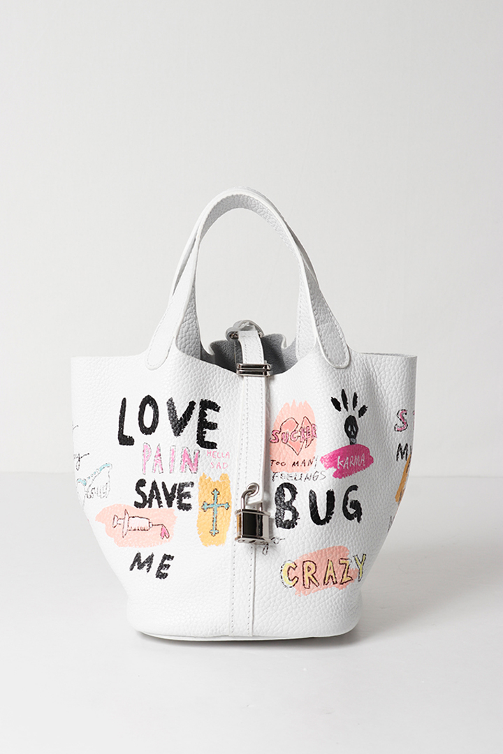 アーティスト、乾シンイチロウ(Shinichiro Inui)によりハンドペイントが施されたレザーバッグ。