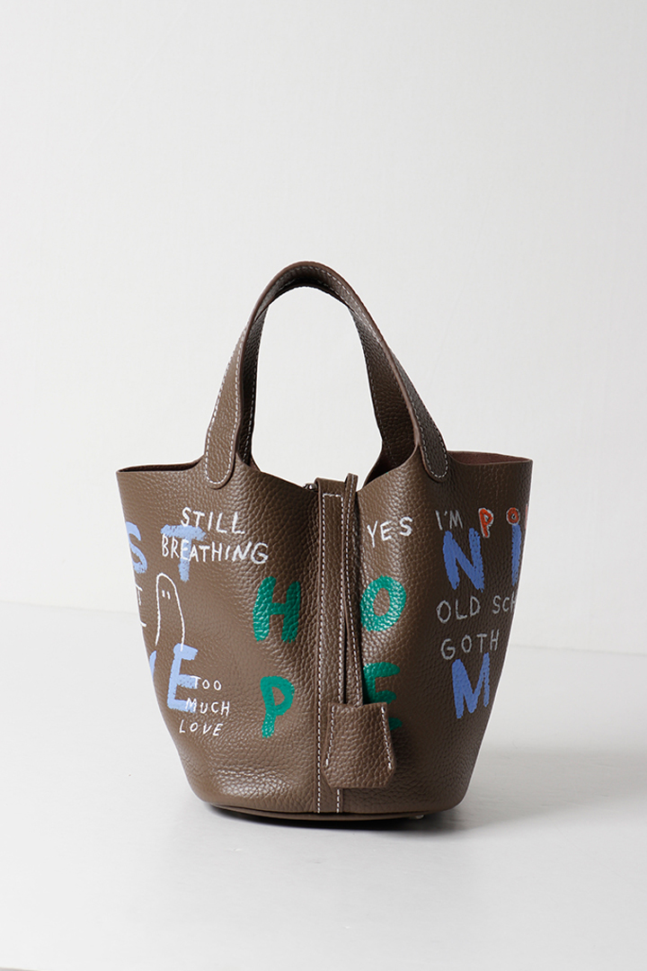 アーティスト、乾シンイチロウ(Shinichiro Inui)によりハンドペイントが施されたレザーバッグ。