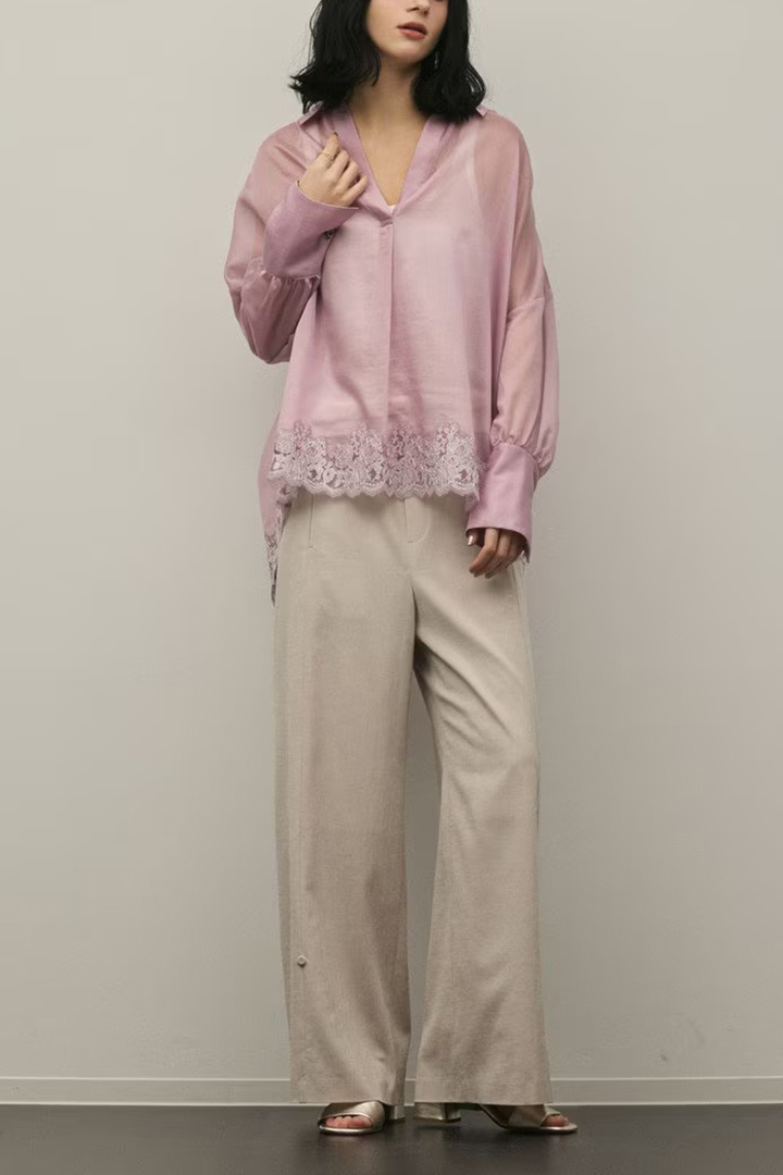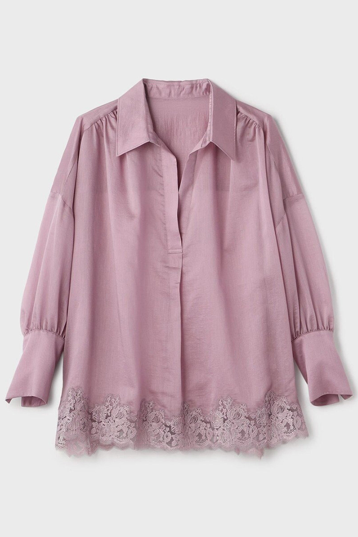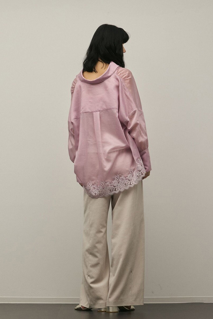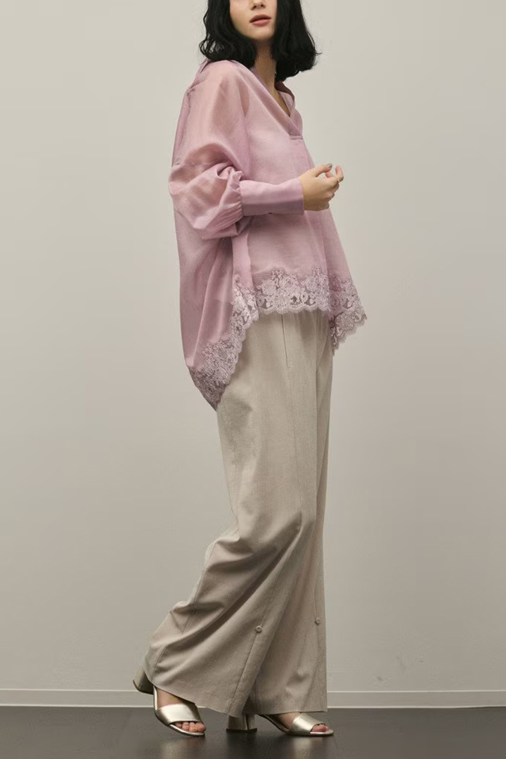肩のギャザーと裾に施した繊細なレースが優しい印象を与え、クラス感溢れる着こなしを叶えます。