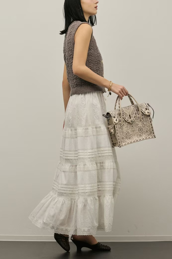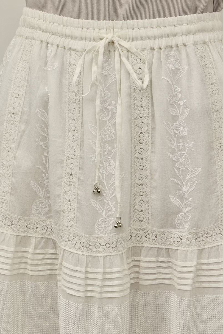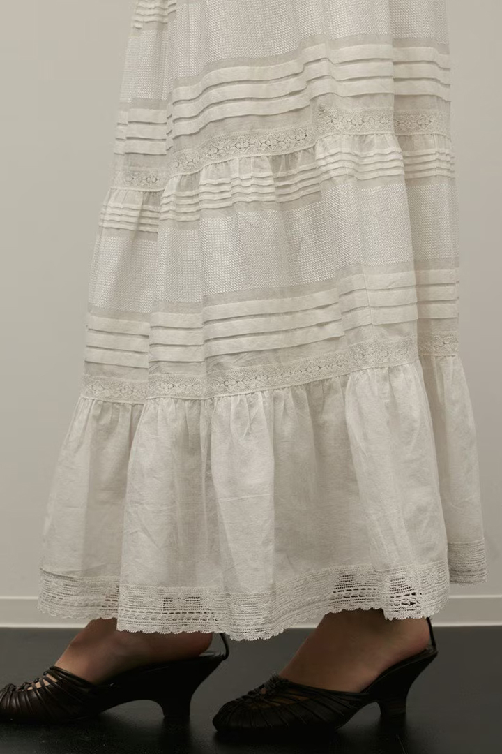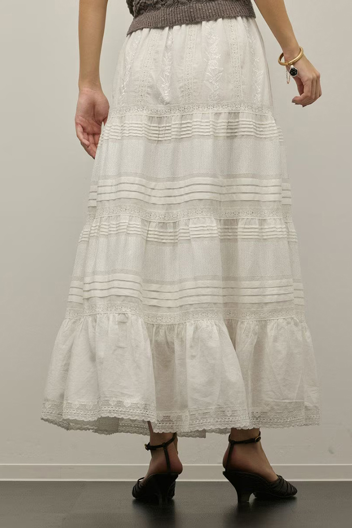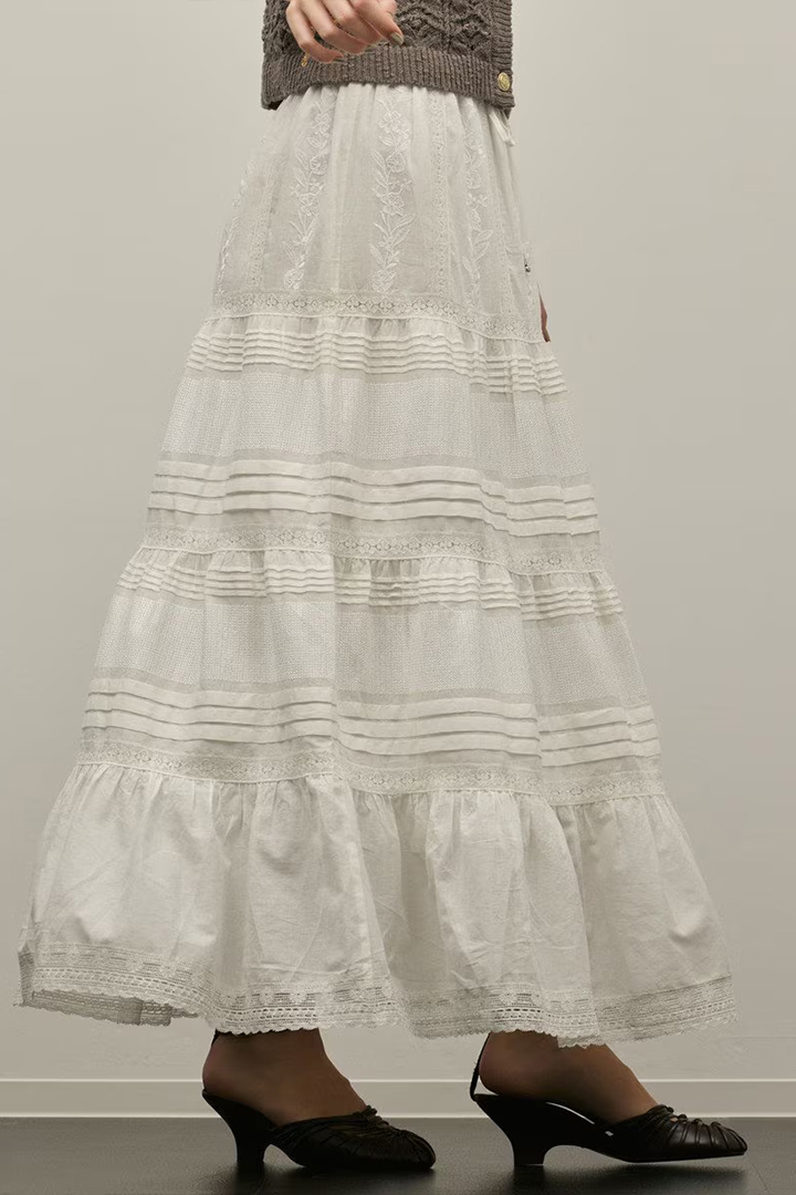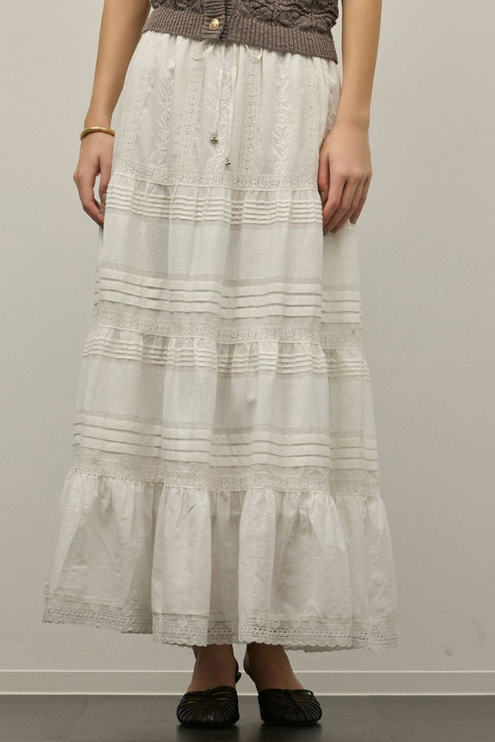 インドならではの柔らかいコットンボイルを使用したティアードスカート。ふんだんに入れたピンタックと繊細な刺繍とレースが意匠性が高く華やかなデザイン。