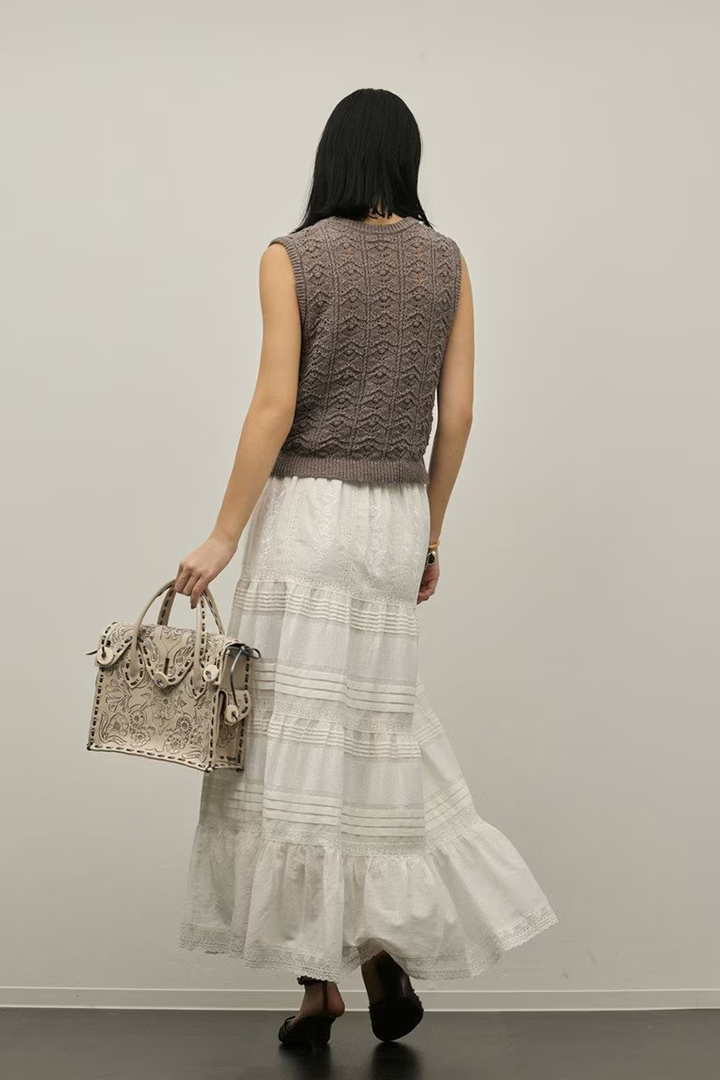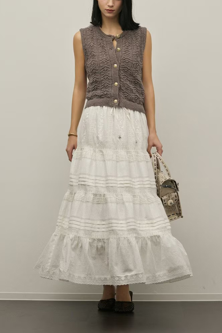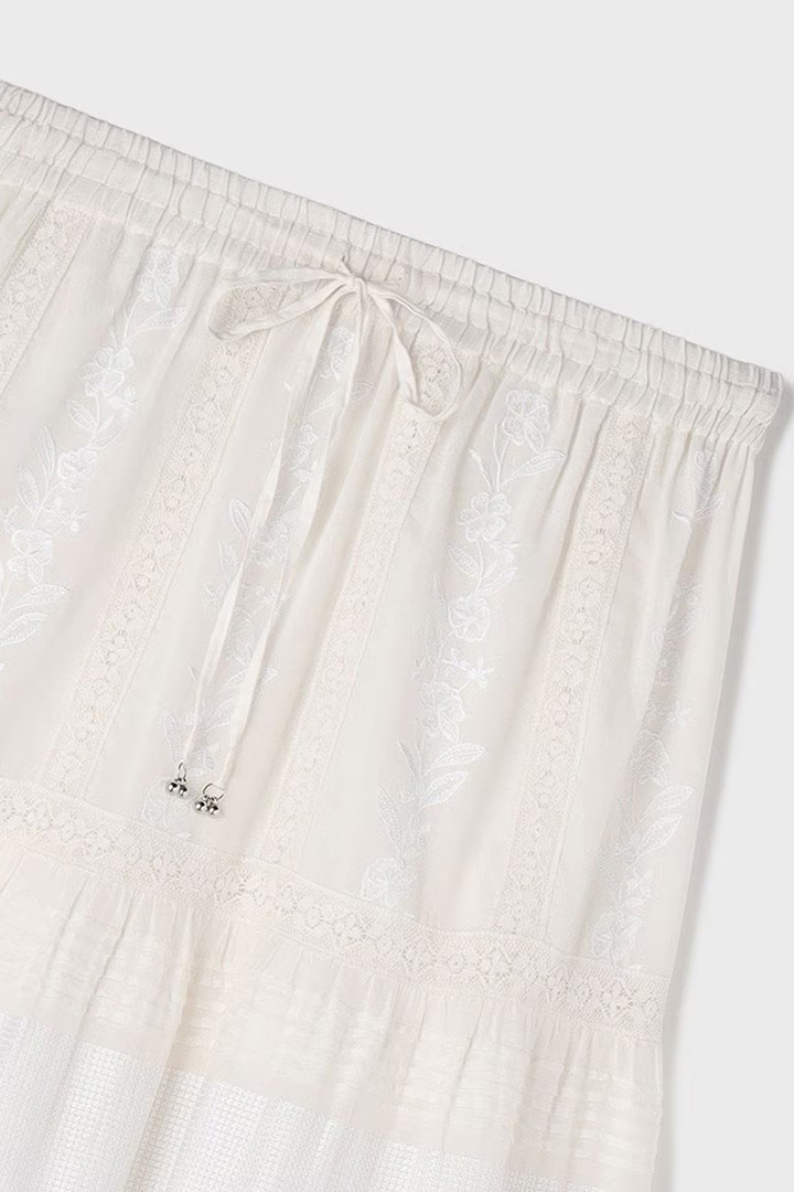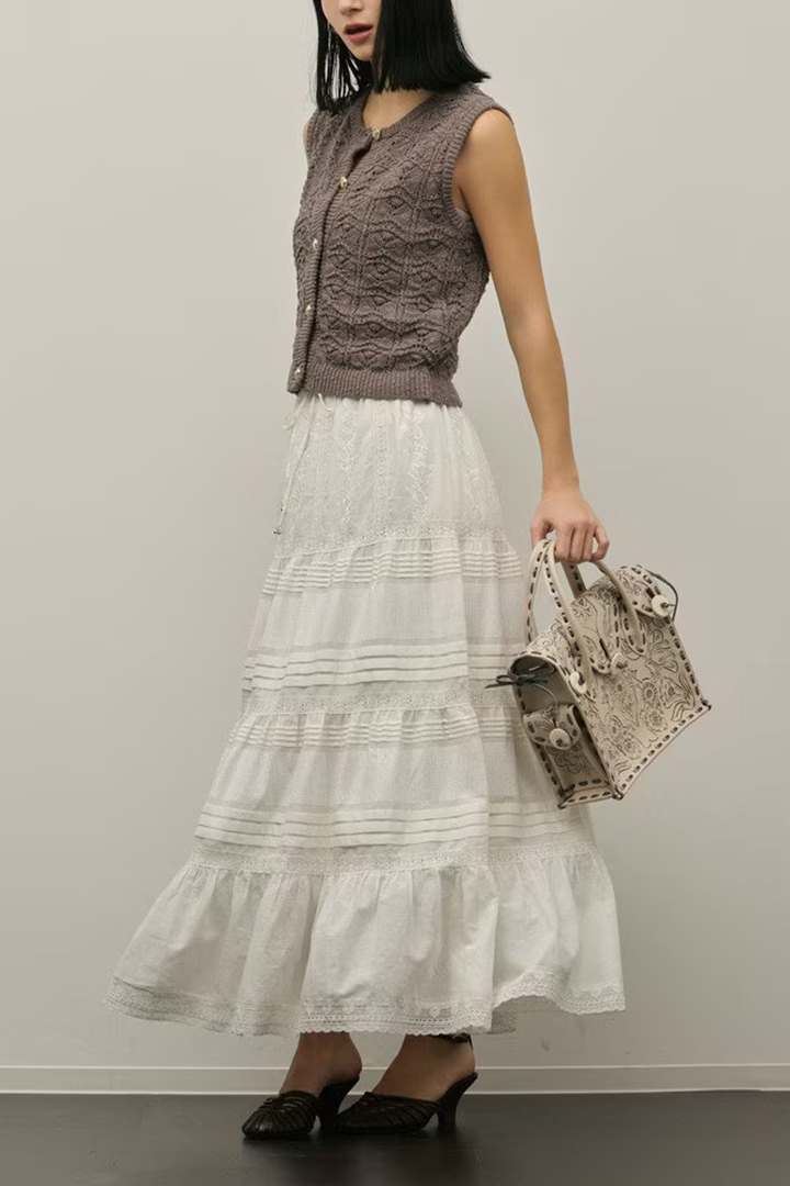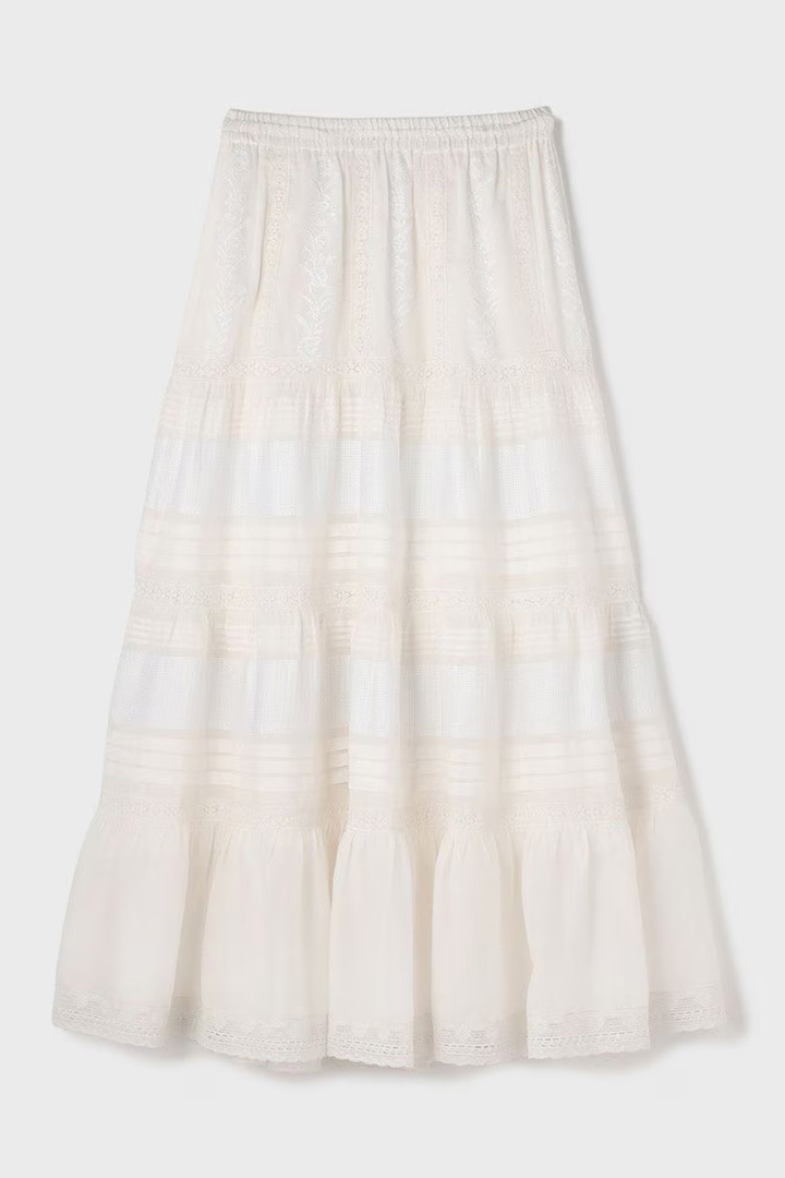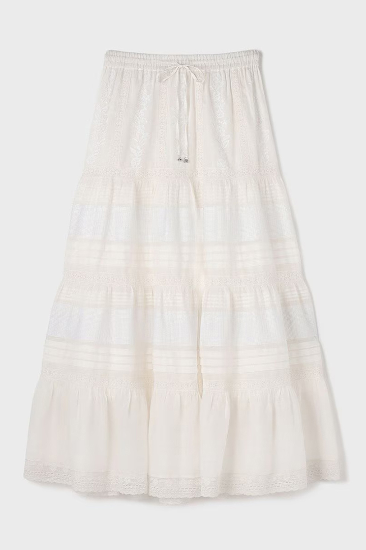 インドならではの柔らかいコットンボイルを使用したティアードスカート。ふんだんに入れたピンタックと繊細な刺繍とレースが意匠性が高く華やかなデザイン。