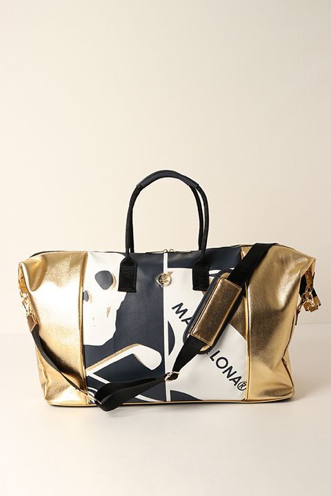 アイアンスカルとカモフラージュ柄をパネル状に大胆に並べてプリントしたデザインのボストンバッグ。細かくシボの入った奥行きのあるメタリックなシンセティックレザーに鮮やかなカラーリングの大柄プリントを施し、ステッチで凹凸を表現。コンビネーションの生地にはシボのあるシンセティックレザーと鏡面エナメルのメタリックシンセティックレザーを使用。アーチ状の天ファスナーは左右の端まで大きく開く仕様で、物の出し入れがスムーズに行えます。ショルダーベルトは上品な艶感のあるシート織のベルトにジャカードのロゴが入っています。ハンドルの根革にはDカンが付いて、ボールポーチなどをぶら下げることができ、デザインアクセントにもなっています。底面には5点の鋲が付き、地面に置いても汚れを気にせず使えます。内側にはファスナーポケットと、16inch Mac Book Proが収納できるサイズのラップトップ用ポケットを搭載。