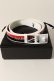 スカルスタッズ入りマーカーがバックルに組み込まれた、牛ヌメ革のリバーシブルベルト。表裏でガラッと雰囲気が変わり、一面はロゴがテープ状に並んだ総柄パターンで、もう一面は無地のモノトーンベースに大きなロゴがひとつ入ったデザインとなります。また剣先も切り替えデザインとなり、一面はロゴで、もう一面にはアイアンスカルをプリント。30mm幅のユニセックスタイプで、サイズ展開も細かく設定できる5段階となっています。