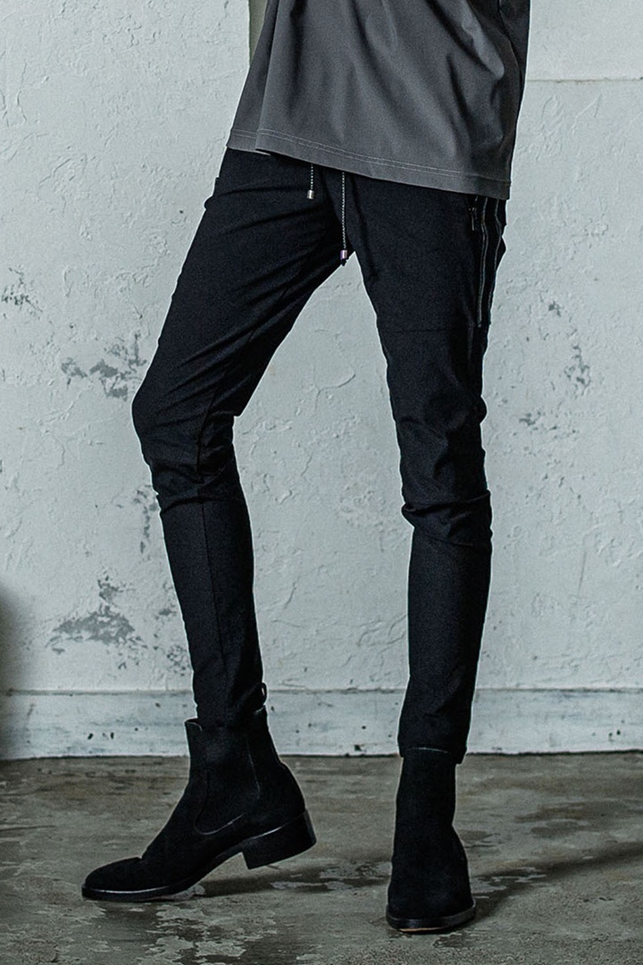 定番ジョンソンナイロンラインパンツ。 快適な素材感と、スポーツ仕様を合わせたナイロンイージーパンツ。 素材はハリがありながら驚くほど伸縮し、復元力も強くしなやかな手触りの360°ストレッチ素材。 コットンより軽く、そして速乾性を兼ね備えた高機能ナイロンマイクロファイバー。 リサウンド定番デニムをイメージした帯幅、ゴムとドローコードを入れ、サイドポケットはファスナー仕様。 バックポケットのデニムをイメージしたホームベース型、膝の切り替え、スポーティーな2本ラインを膝上まで入れ 立体感を出したデザインに仕上げました。 カットソーやスウェットの縫い仕様ではなく、布帛の本縫い仕様で作成。 シルエットは膝から裾にかけてスーパースキニーパンツのように 絞り込んだスーパータイトテーパードシルエット、膝からかなりタイトなシルエットです。 素材、デザイン、仕様と言った妥協を一切しない ラグジュアリースポーツスタイルに最適な1本です。