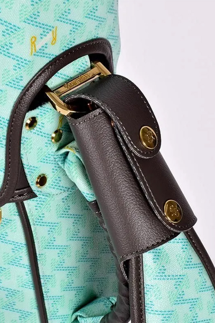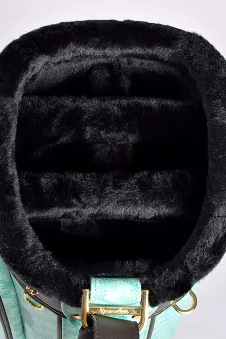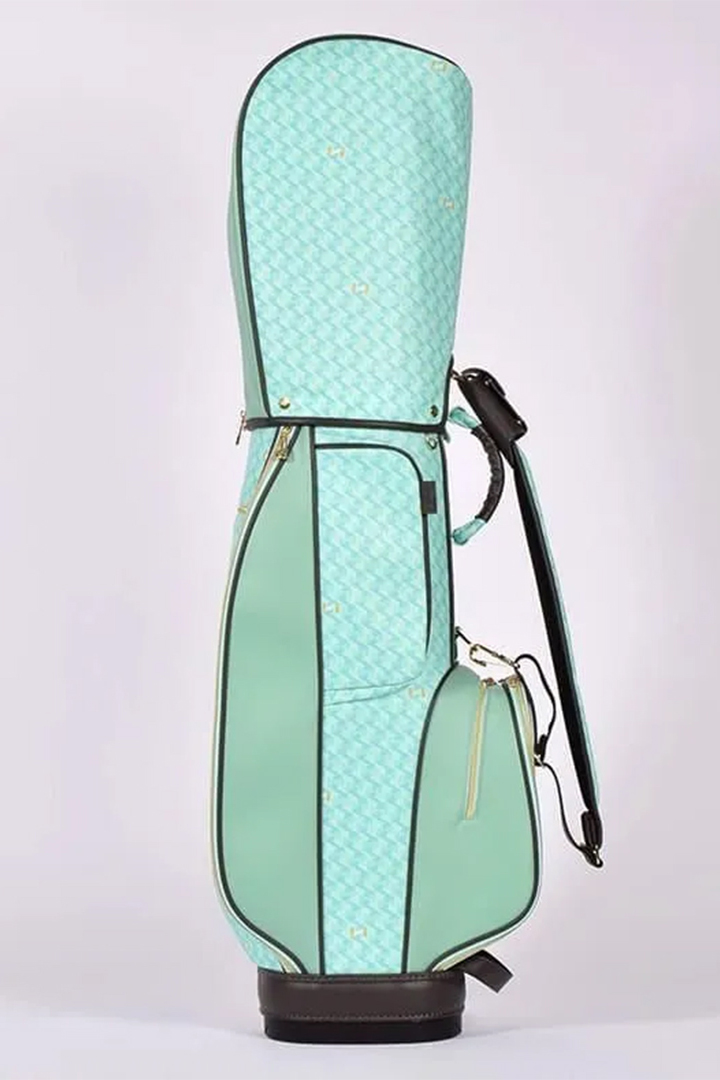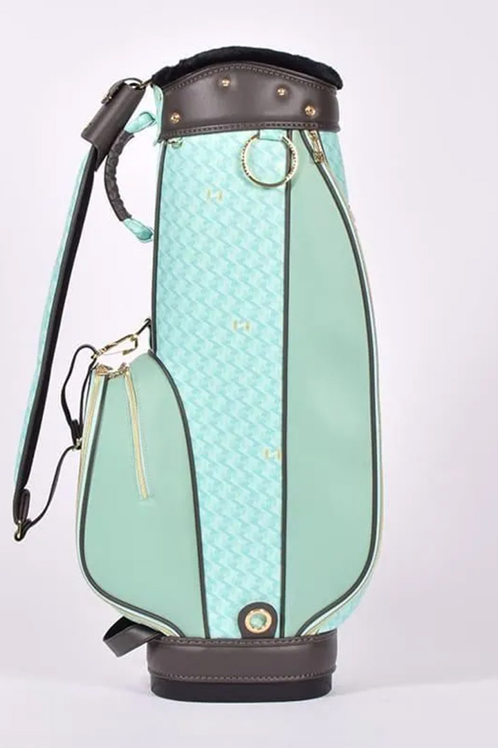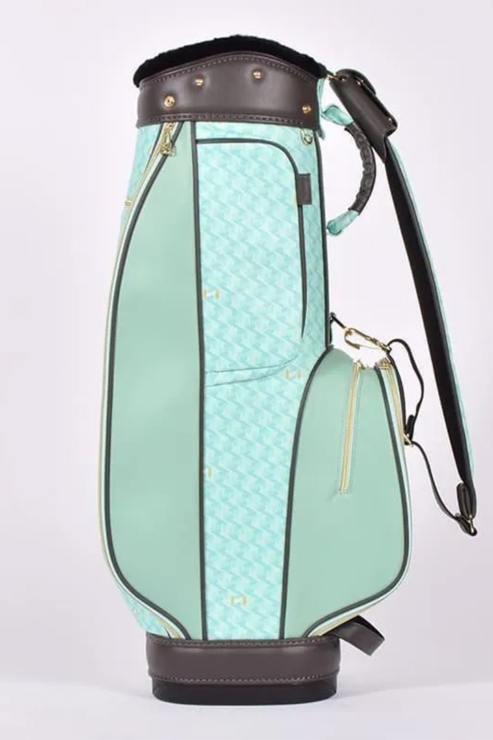 中心にはブランドロゴをあしらい全体的に角を出したデザインの金属パーツが加わることで、キャディバッグの雰囲気がグッと引き締まり、一気に高級感がアップ致しました。