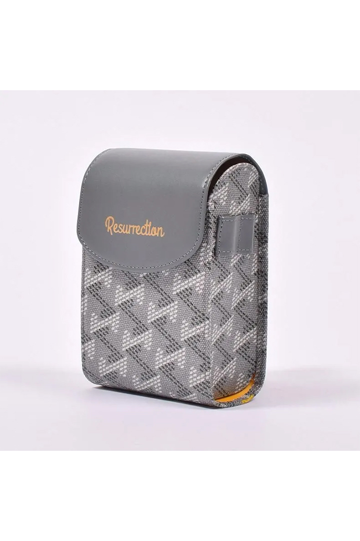 今回はフラップにレザーを採用。幾何学模様の生地とレザーのシンプルな美しさは高級感も兼ね備えています。さらにブランドロゴをゴールドの箔押しで表現しグッと心惹かれる見た目に。