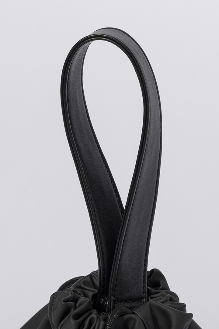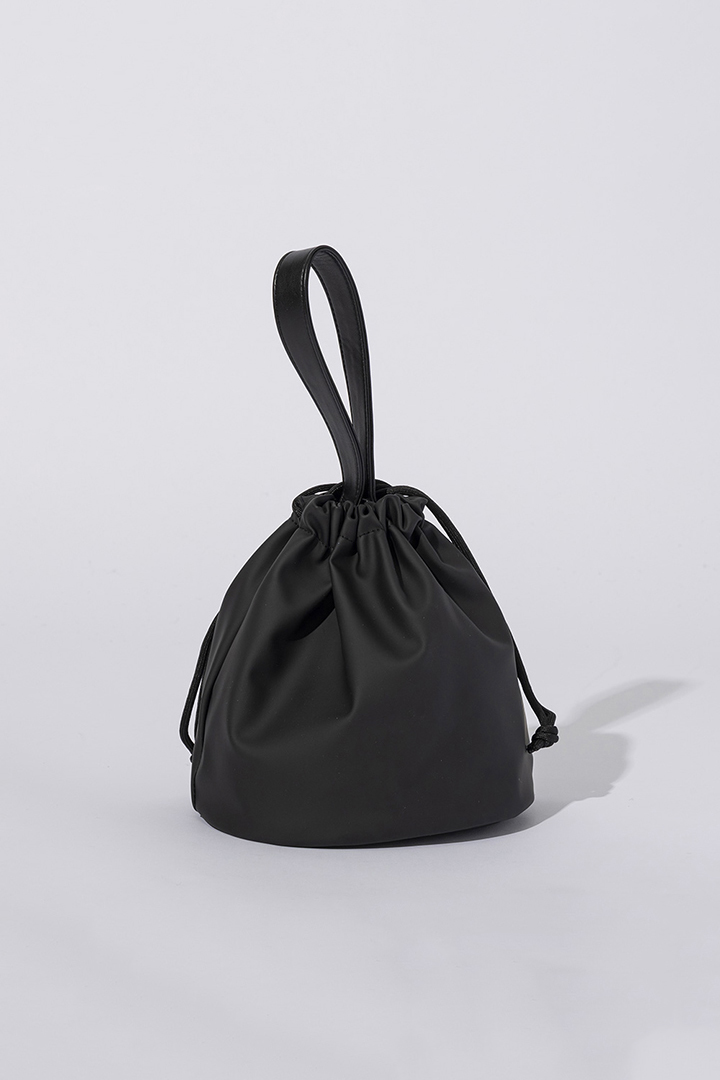滑らかな艶感が上品なフェイクレザーを採用した巾着型のミニバッグ。