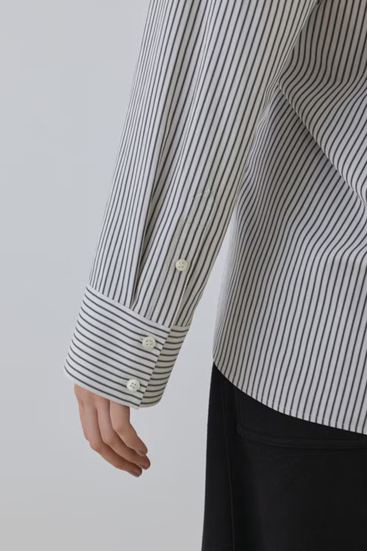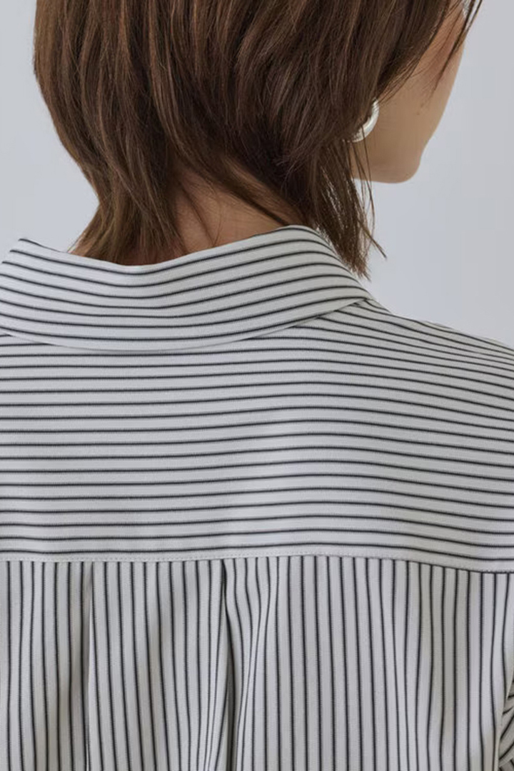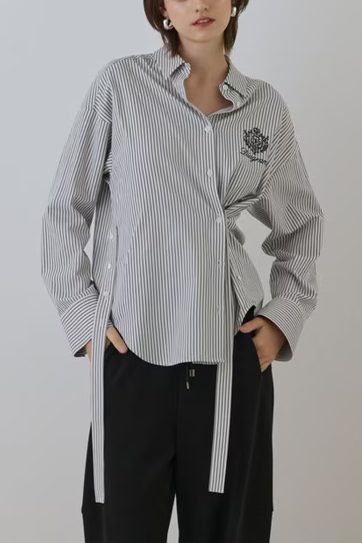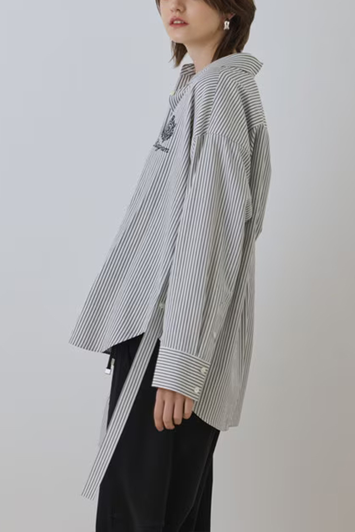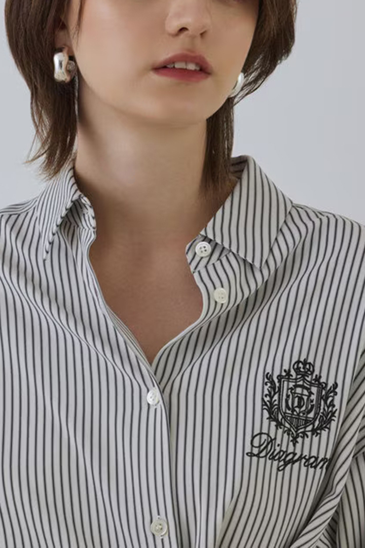 爽やかな細ピッチのストライプに、オリジナルのエンブレム刺繍を施したシャツ。