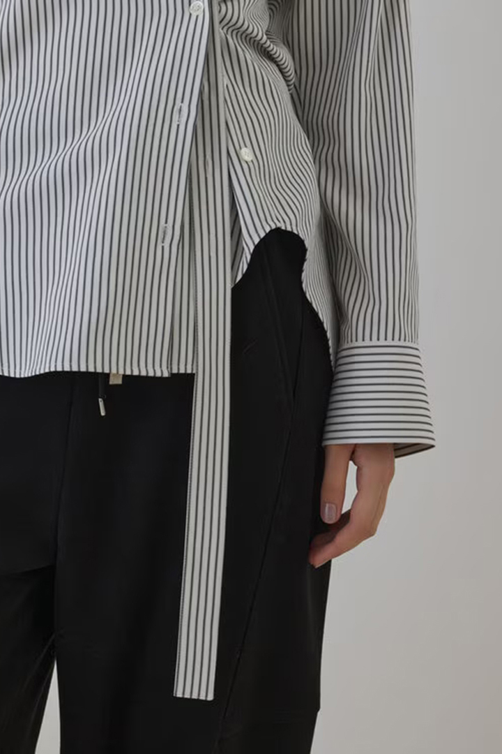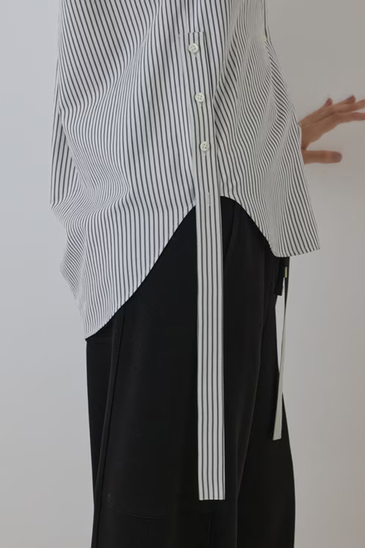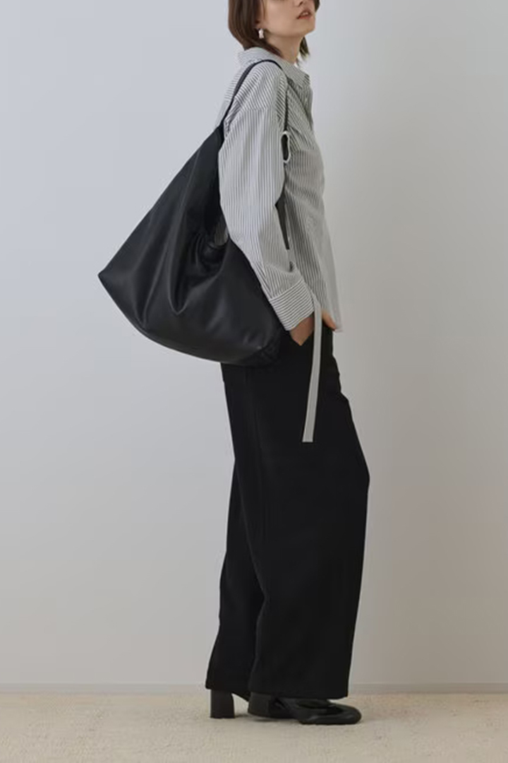 脇のベルトを使い、タックアレンジでまた違ったシルエットを楽しめる様にお作りしたモードなデザインです。