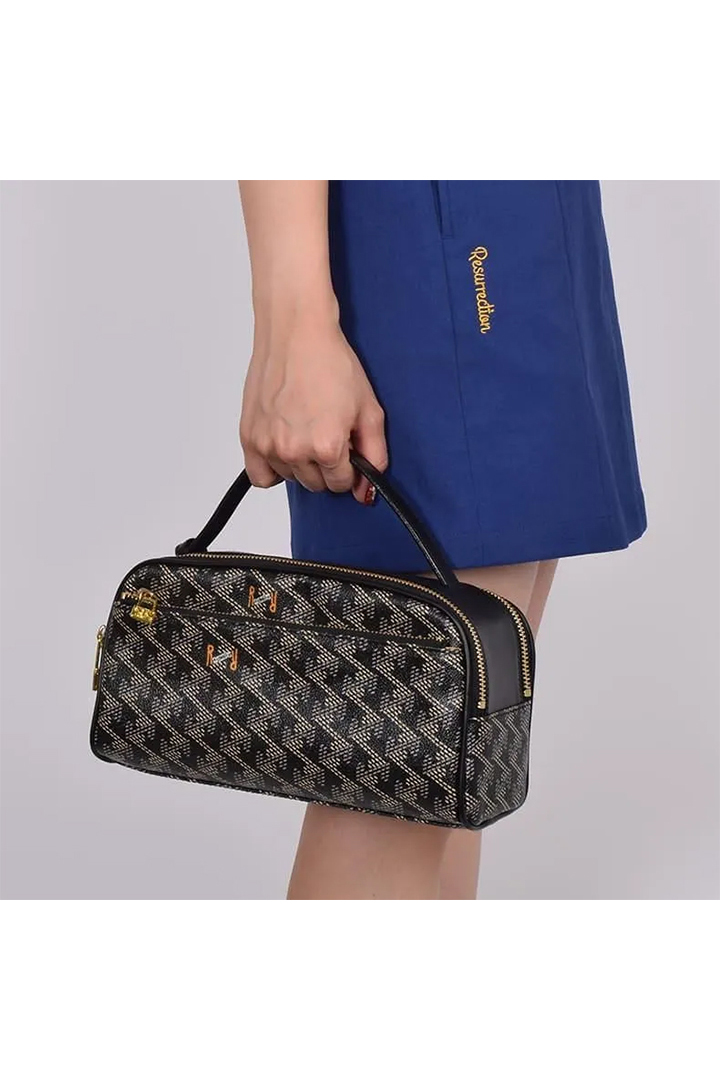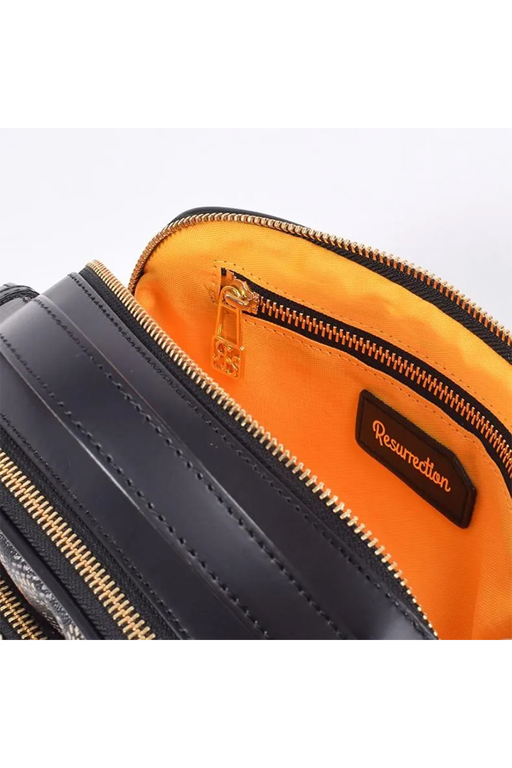 ハンドルやパイピングには本革を使用し、ゴールドの金具とファスナーが高級感を際立たせます。シンプルな中にも品格が漂う、レザレクションらしいディテールワーク。