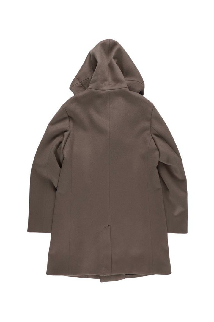 大きめなフードが特徴的なフーデットコートはフードが前に落ちるように分量配分し、