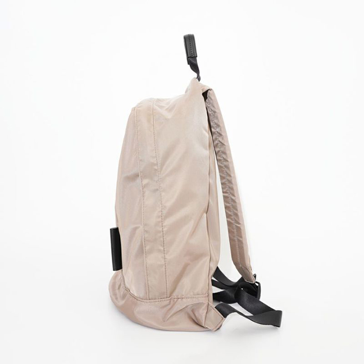 弱撥水の柔らかく光沢感のあるナイロン素材のバックパック。