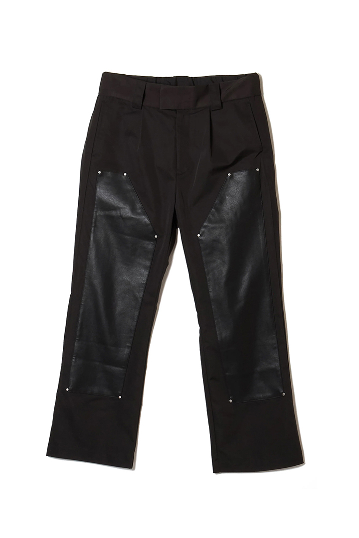 微光沢のあるツイル生地にエコレザーを使用したダブルニーパンツ。