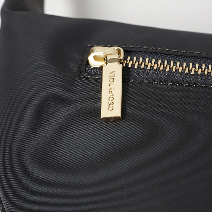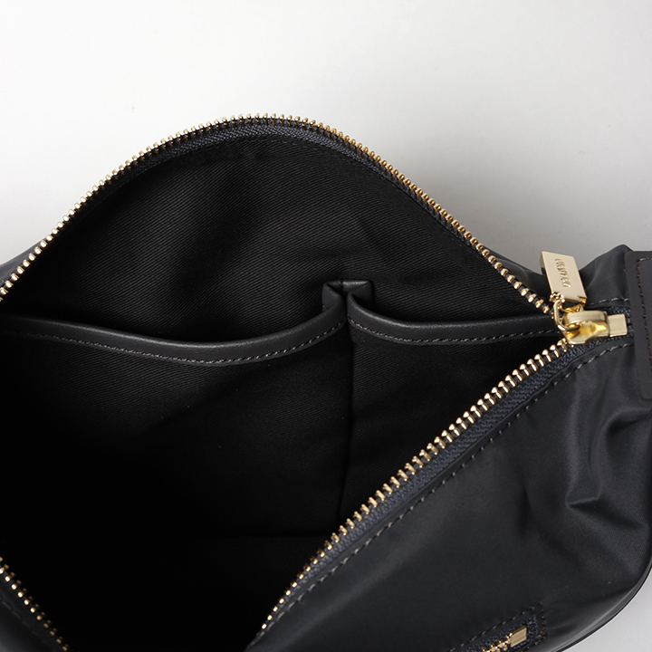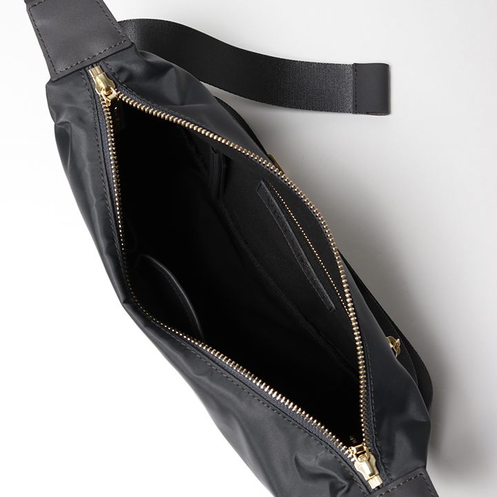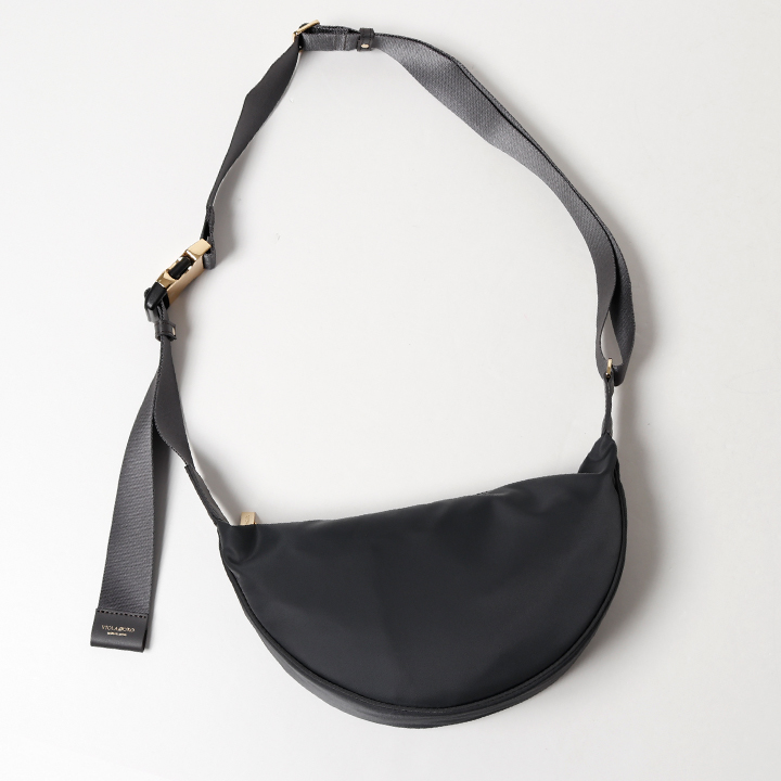 弱撥水性のあるカジュアルなナイロン素材に金具のゴールド使いが女性らしいボディバッグ。