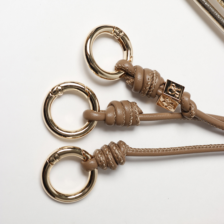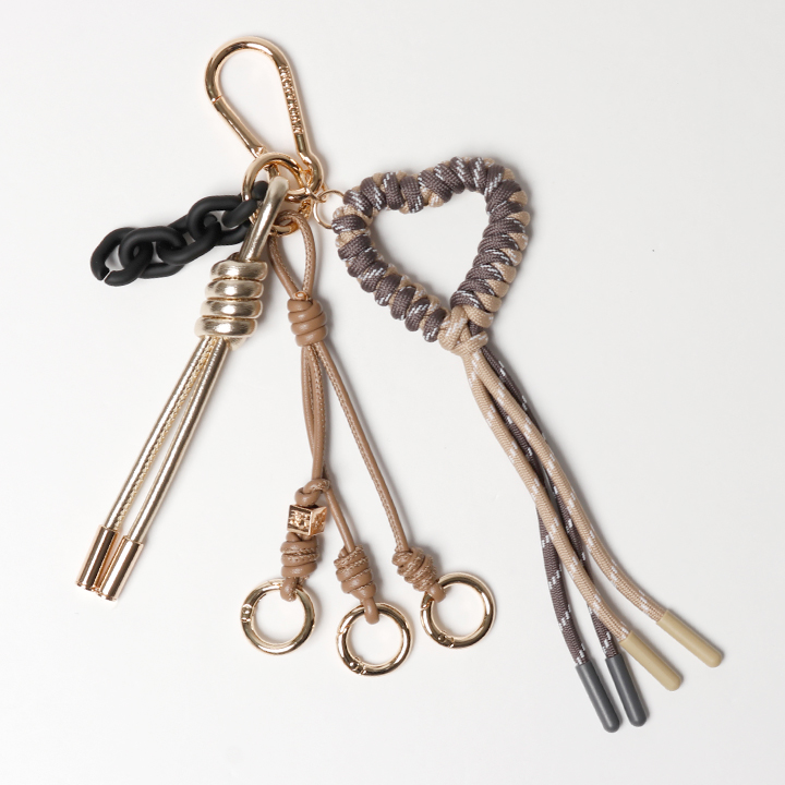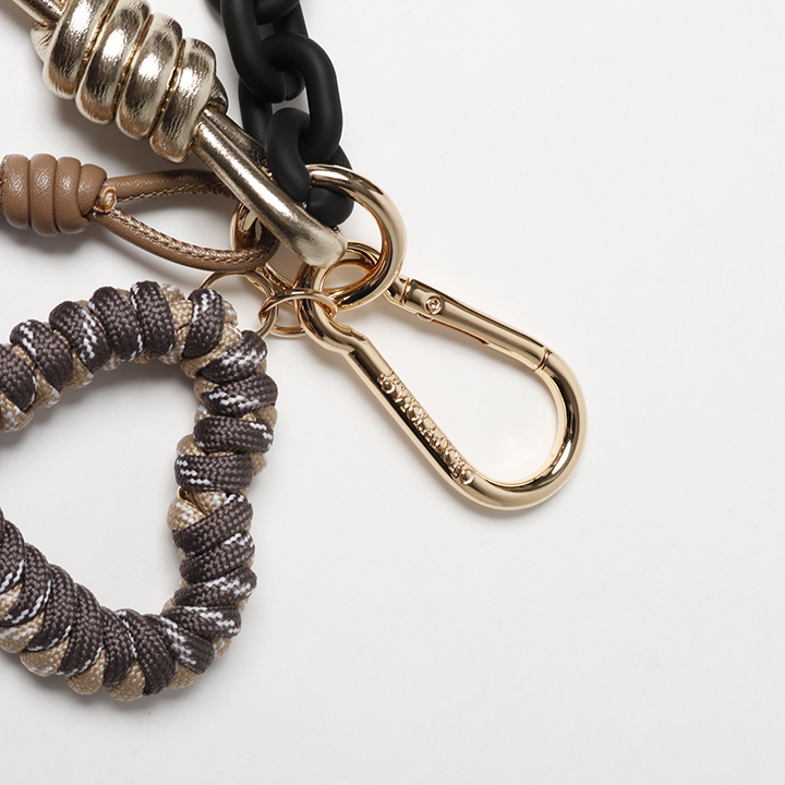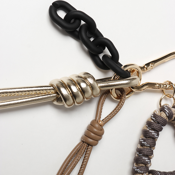 レザーコードとカナビラ付きチャーム、アクリルチェーンがセットになっています。