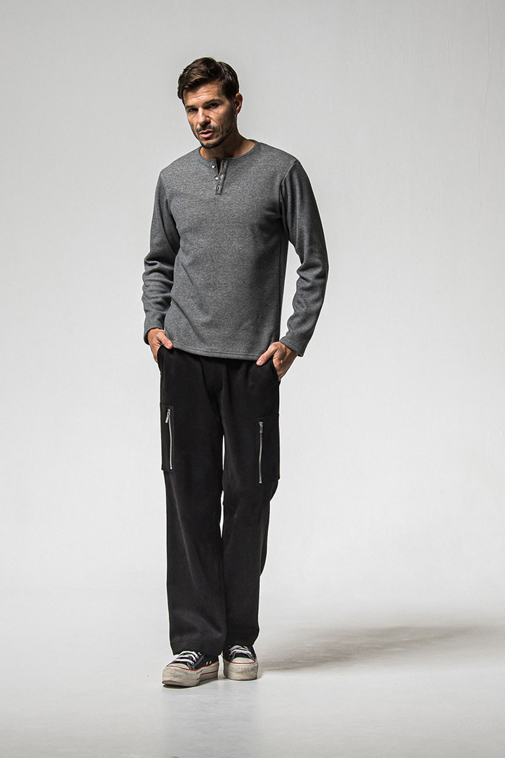 シルエットは腰、ヒップ周りはややタイト、腿周りからゆとりを持たせストンと落とした緩めのストレートシルエット。裾にゴムを入れドローコードも中に入れ、デニムのような前開き仕様
