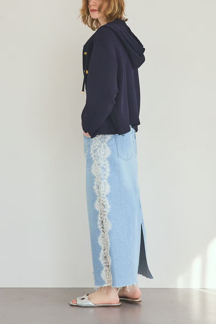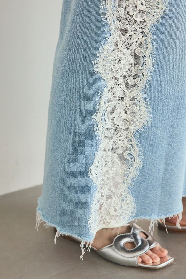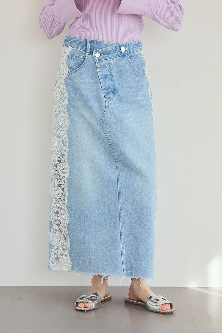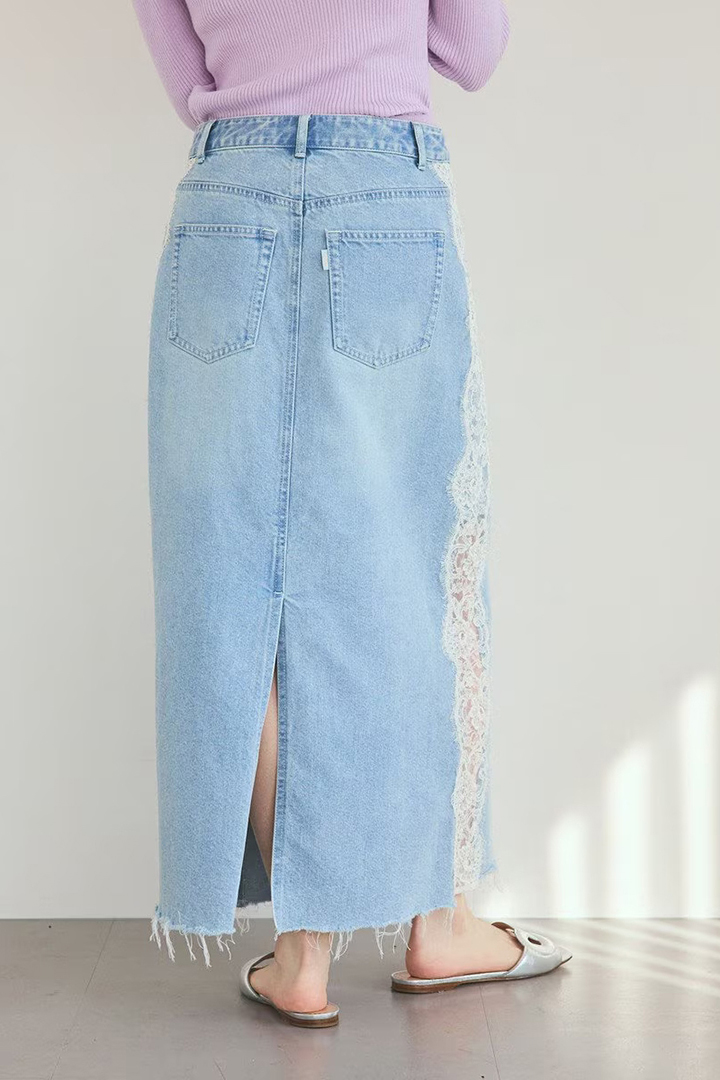 定番のデニムスカートにレースを組み合わせ、新鮮な表情に仕上げた一着。
