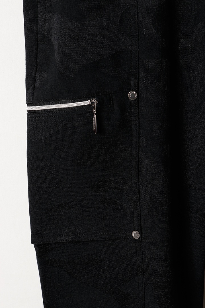カモフラージュパターンのストレッチジャカード素材を使用したロングパンツ。上品な光沢感と適度なストレッチ性を兼ね備えた季節を問わず活躍する万能アイテム。