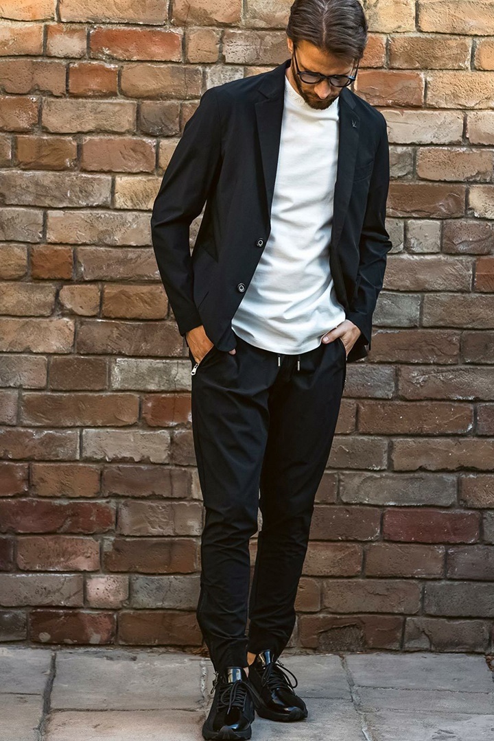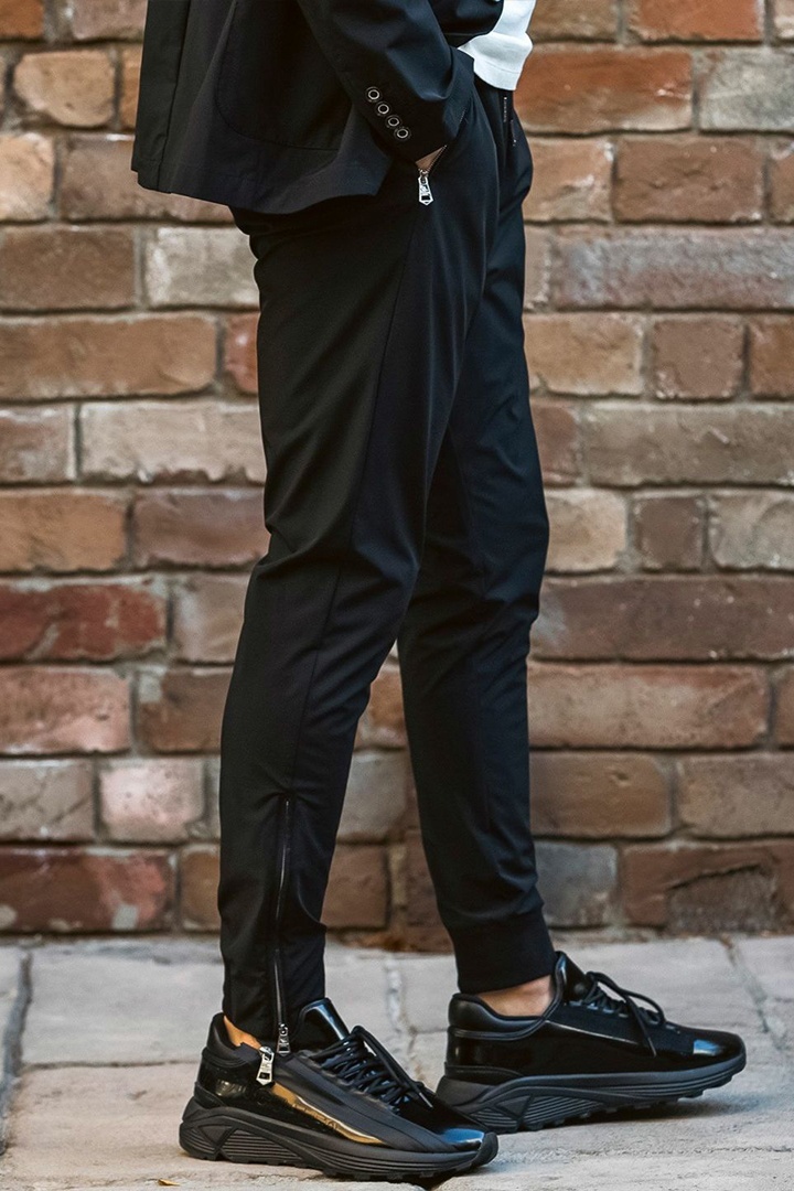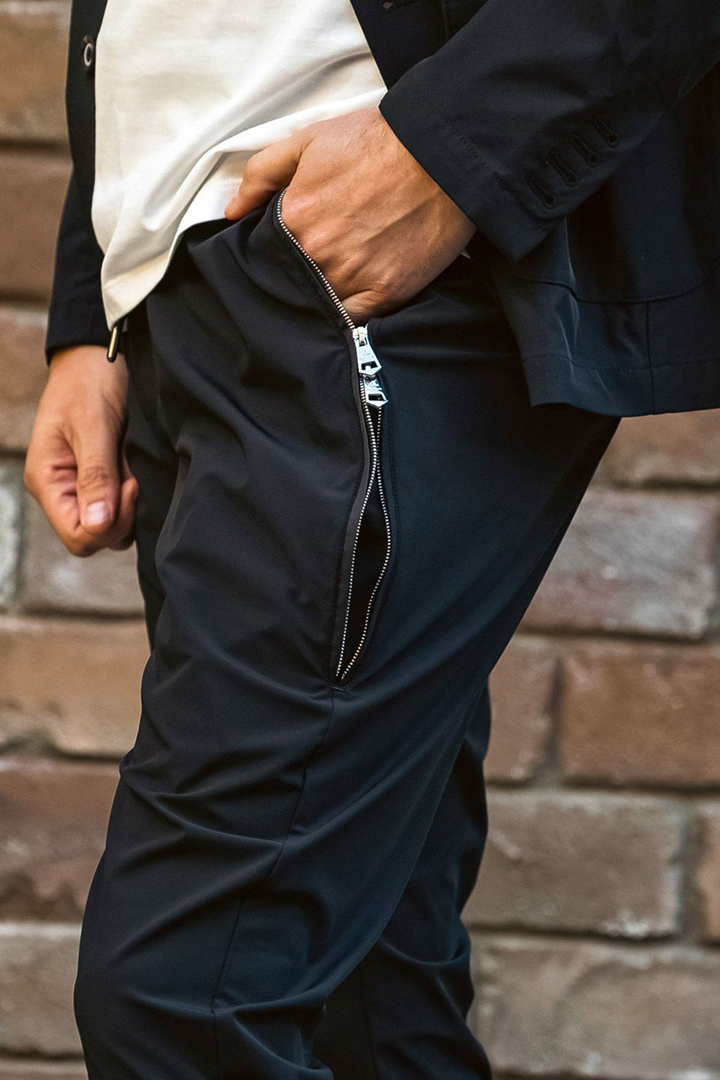 左右に走るアシンメトリーなファスナーポケットがモードなアクセントをプラス。