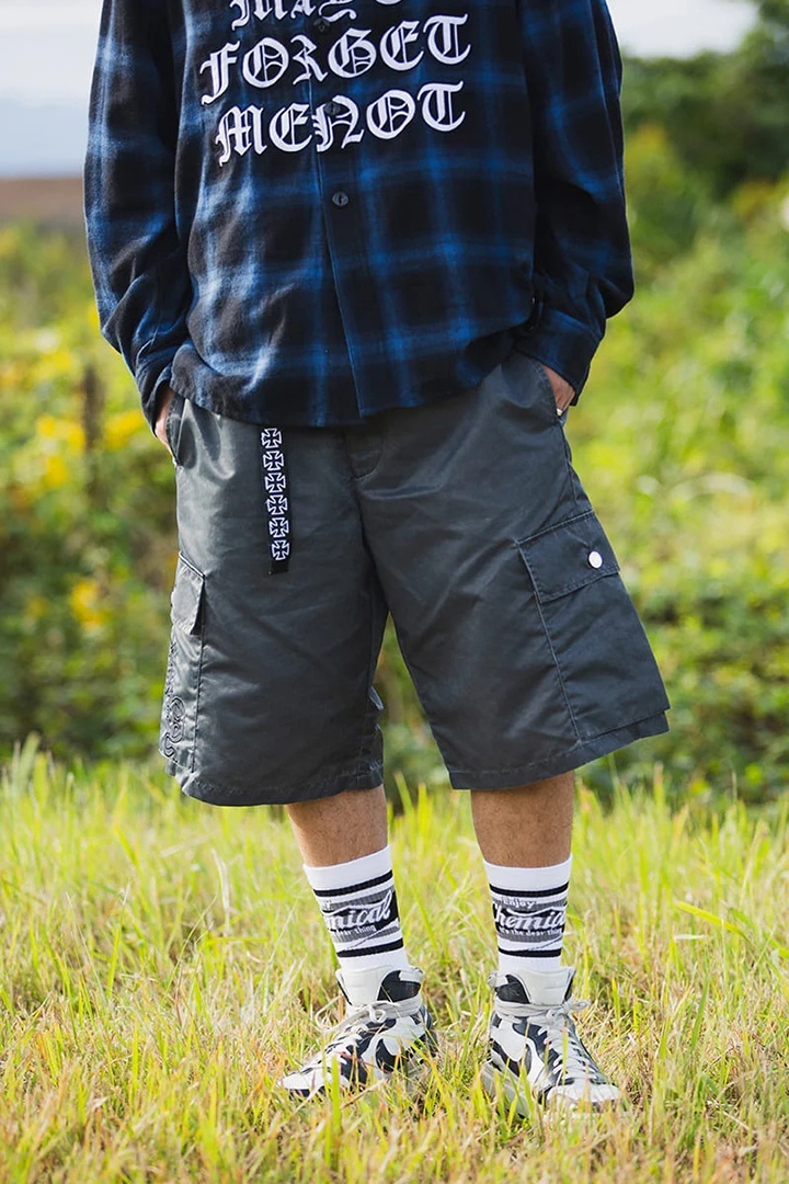 加工によりヴィンテージの様にフェードがかかったナイロン素材を使用したカーゴショーツ。
