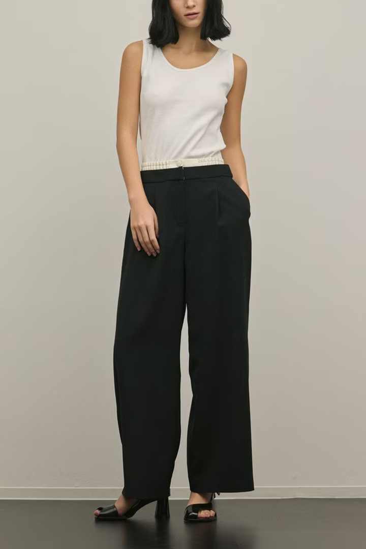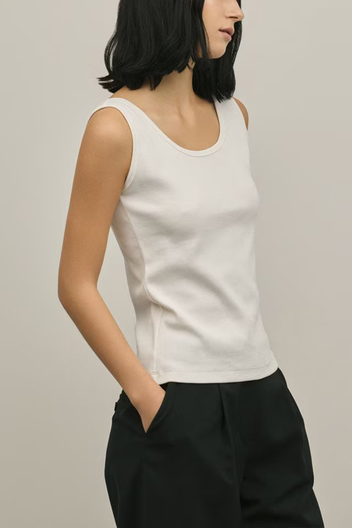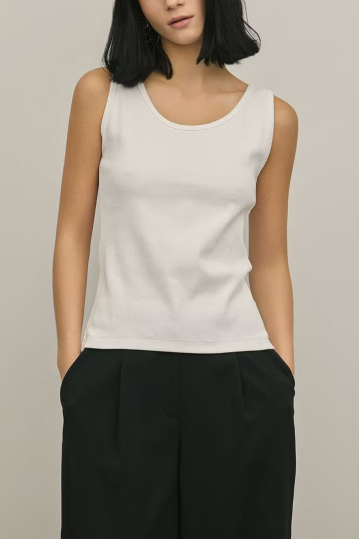 ワードローブの定番として相応しい、シンプルなノースリーブカットソー。