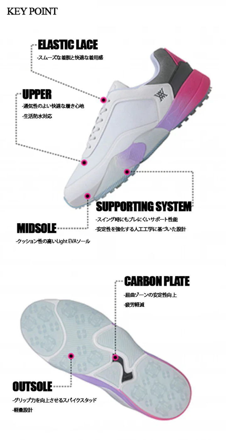 足の動きにしなやかにフィットしながら、スイング時にはしっかりと安定感を発揮します。 ミッドソールにLight EVAを採用し、衝撃吸収と反発性を両立。