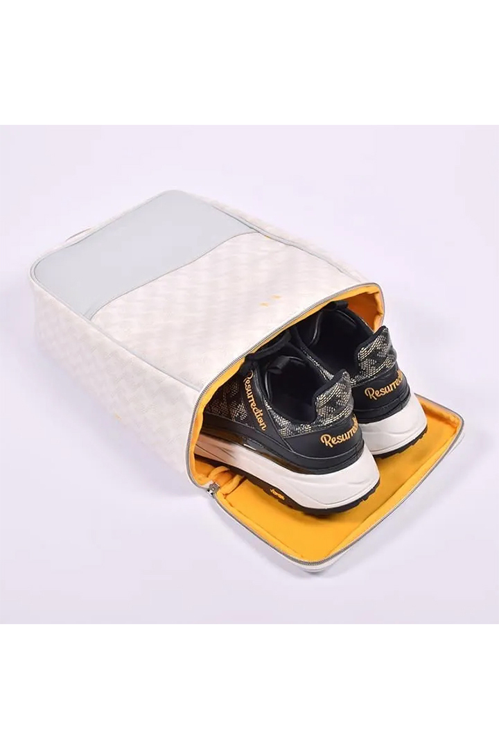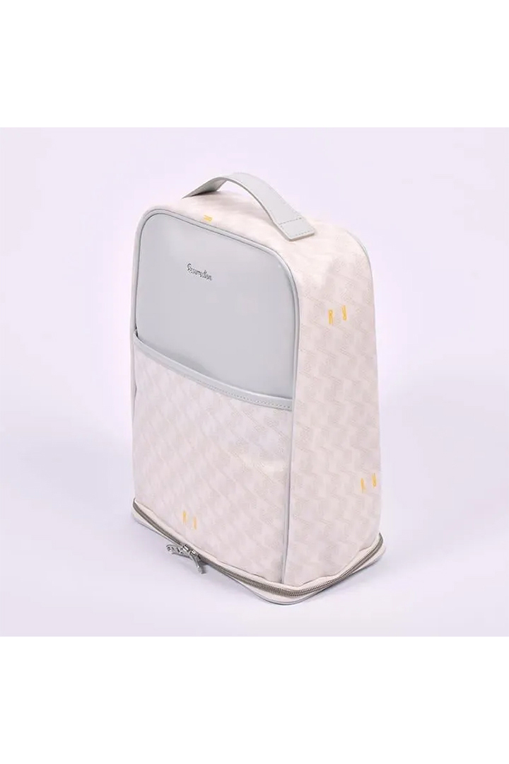もう一つの特徴は、立てたまま置ける設計。クラブハウスでの受付時やラウンド後のひととき、ボストンバッグと並べても、シューズケースを横にすることなく美しく配置が可能です。
