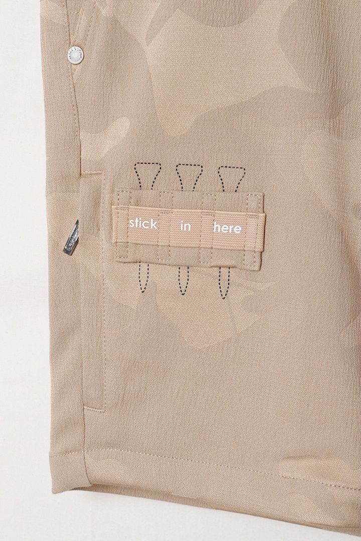 カモフラージュパターンのストレッチジャカード素材を使用したショートパンツ。上品な光沢感と適度なストレッチ性を兼ね備えた季節を問わず活躍する万能アイテム。