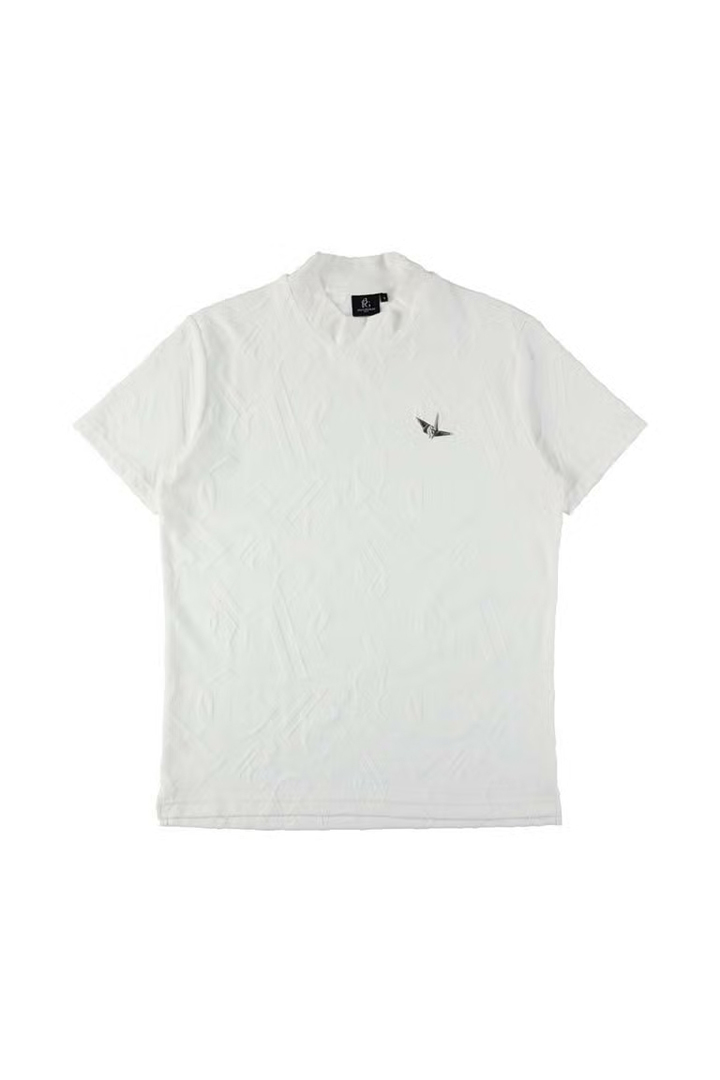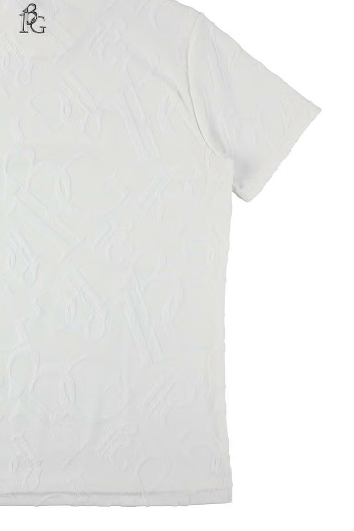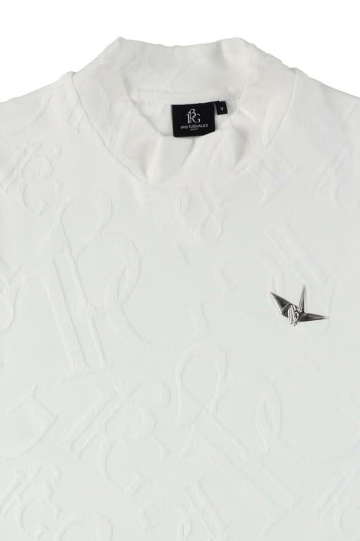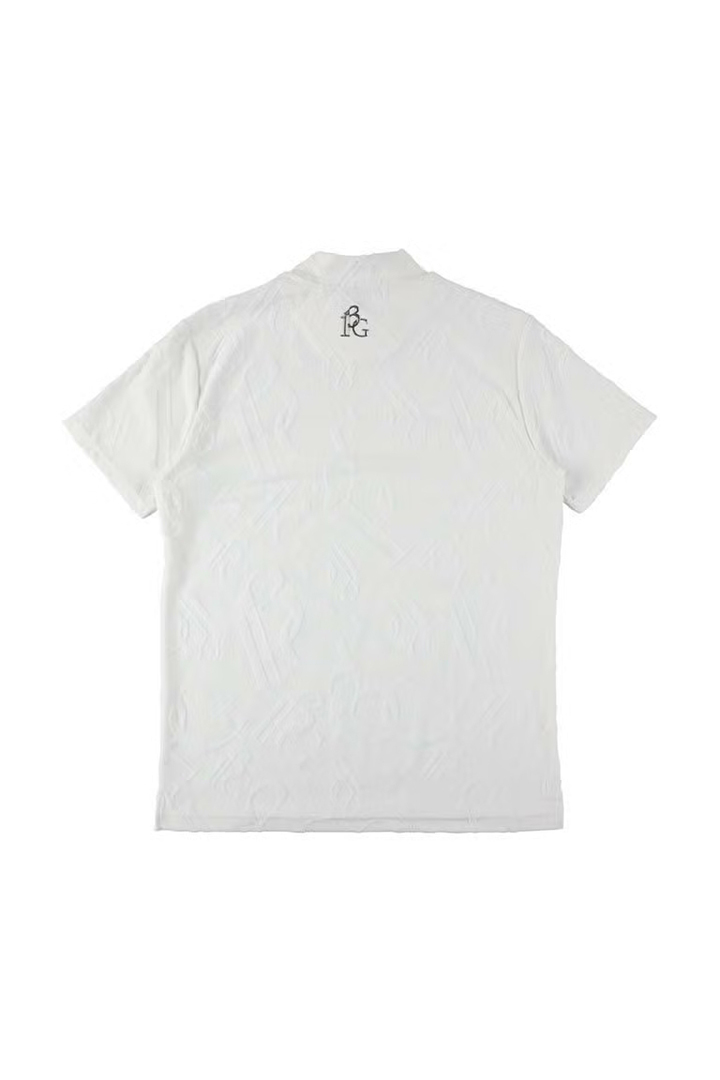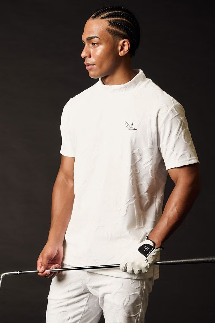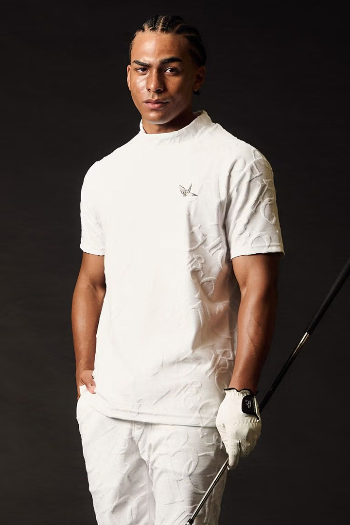 1PIU1UGUALE3 GOLFのアイデンティティを象徴するオリジナルロゴを高度なジャガード技術で表現した特別なパイル・モックネックシャツ。厳選されたコットンとポリエステルを独自の黄金比でブレンドすることで、天然素材の優しく柔らかな肌触りとゴルフシーンに欠かせない吸湿性・形状安定性を高い次元で両立させました。最大の特徴は、独自の織りによって浮かび上がる立体的なモノグラム柄。光の角度によって絶妙な陰影を生むパイルジャガードは、プリントでは決して表現できない奥行きと重厚感を放ち、首元のモックネックデザインがその洗練された表情をより一層モダンに際立たせます。汗を素早く吸収しながらもパイル特有のふんわりとしたボリュームが肌へのベタつきを抑え、真夏のプレー中も常にリラクシングでラグジュアリーな着心地をキープ。コース上での圧倒的な存在感はもちろん、ジャケットのインナーとしても映えるその佇まいは、アフターゴルフのクラブハウスでも格別の気品を漂わせます。