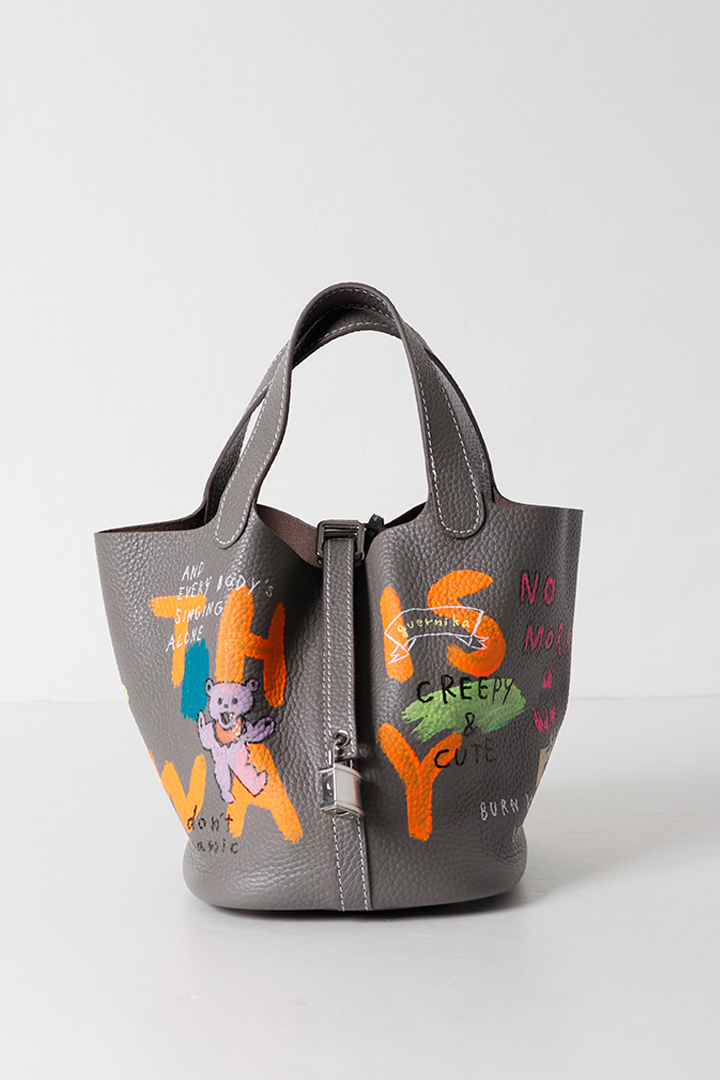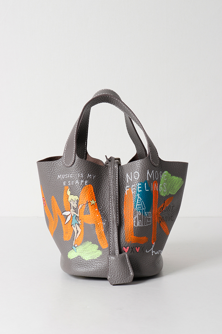 アーティスト、乾シンイチロウ(Shinichiro Inui)によりハンドペイントが施されたレザーバッグ。
